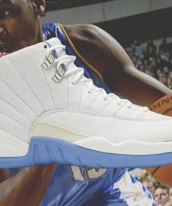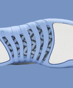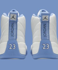 The Air Jordan 12 features a premium white leather upper with quilted details on the sidewalls. These details radiate outward like sun rays, enhancing the shoes visual appeal and sophistication. University Blue accents provide a bold contrast, catching the eye immediately. Metallic Silver upper eyelets add elegance, giving the sneaker a polished look.