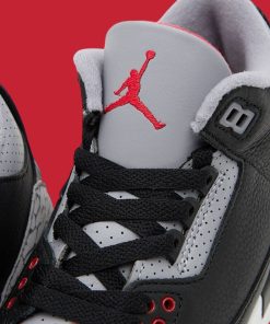 Remastered faithfully, the Air Jordan 3 flaunts a captivating color palette, blending Black, Fire Red, Cement Grey, and Sail for a nostalgic vibe. Featuring Black tumbled leather, distinctive elephant print overlays, and striking Fire Red accents, its a trip down memory lane for fans. Complete with the cherished Nike Air emblem on the heel tabs and improved cushioning showcasing visible Air units, this rendition stays loyal to its legacy, grounded in timeless elegance with a Cement Grey rubber outsole.