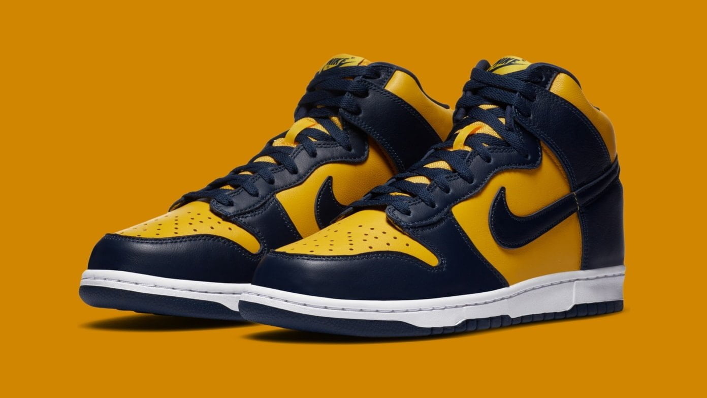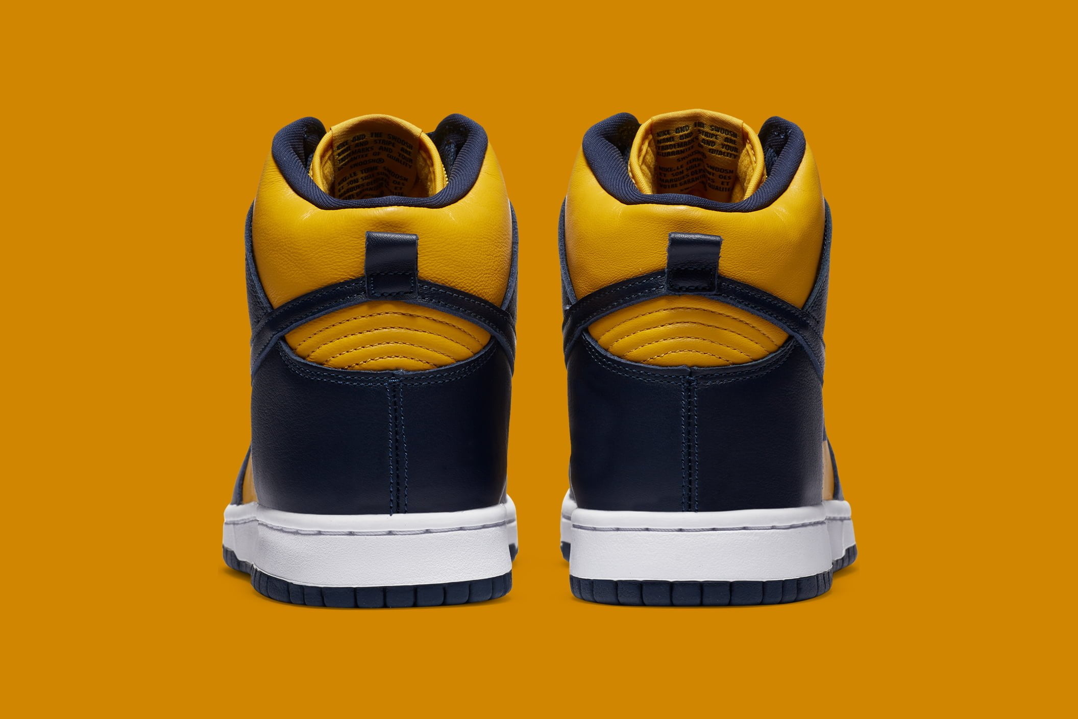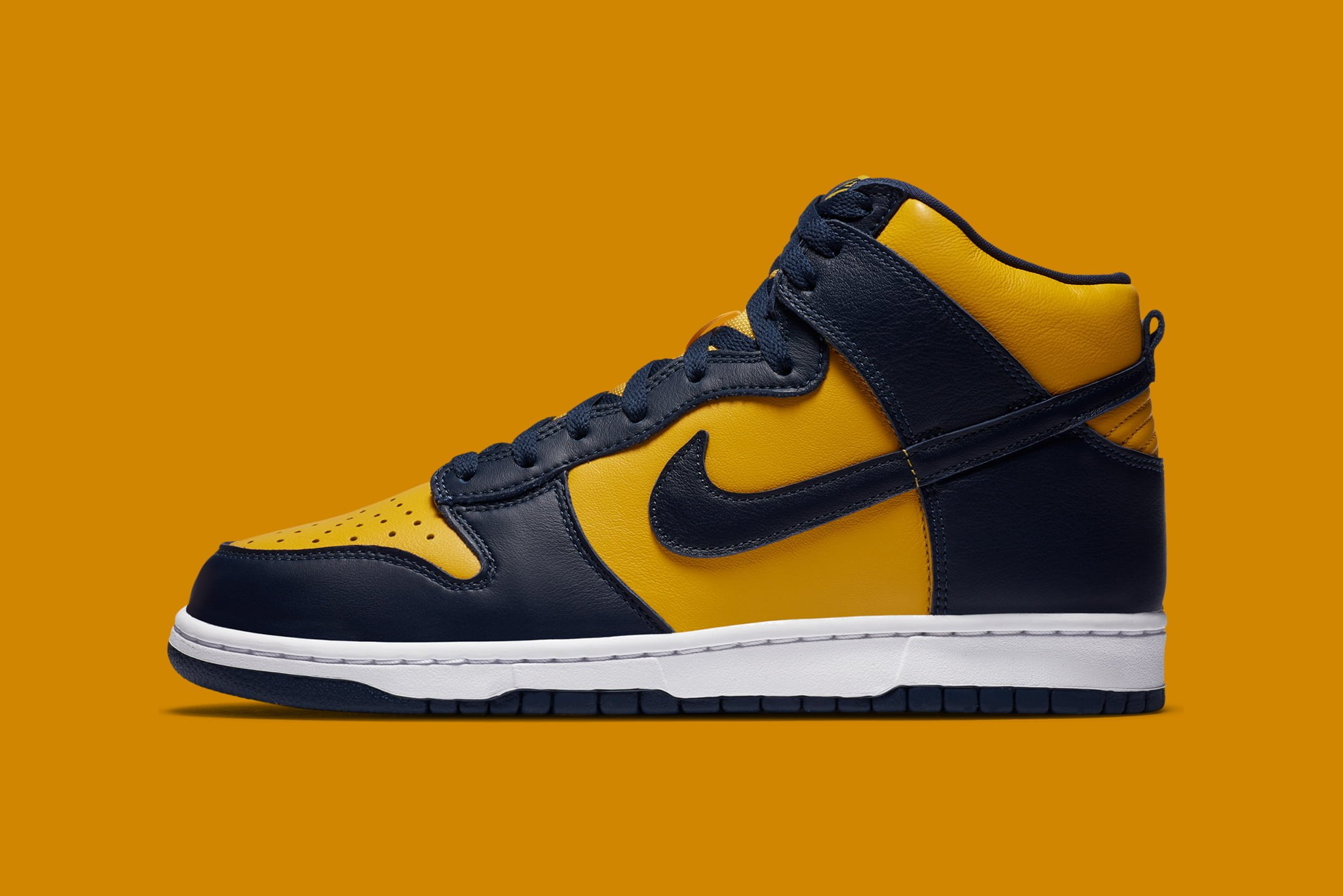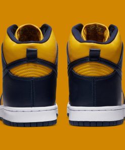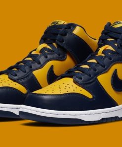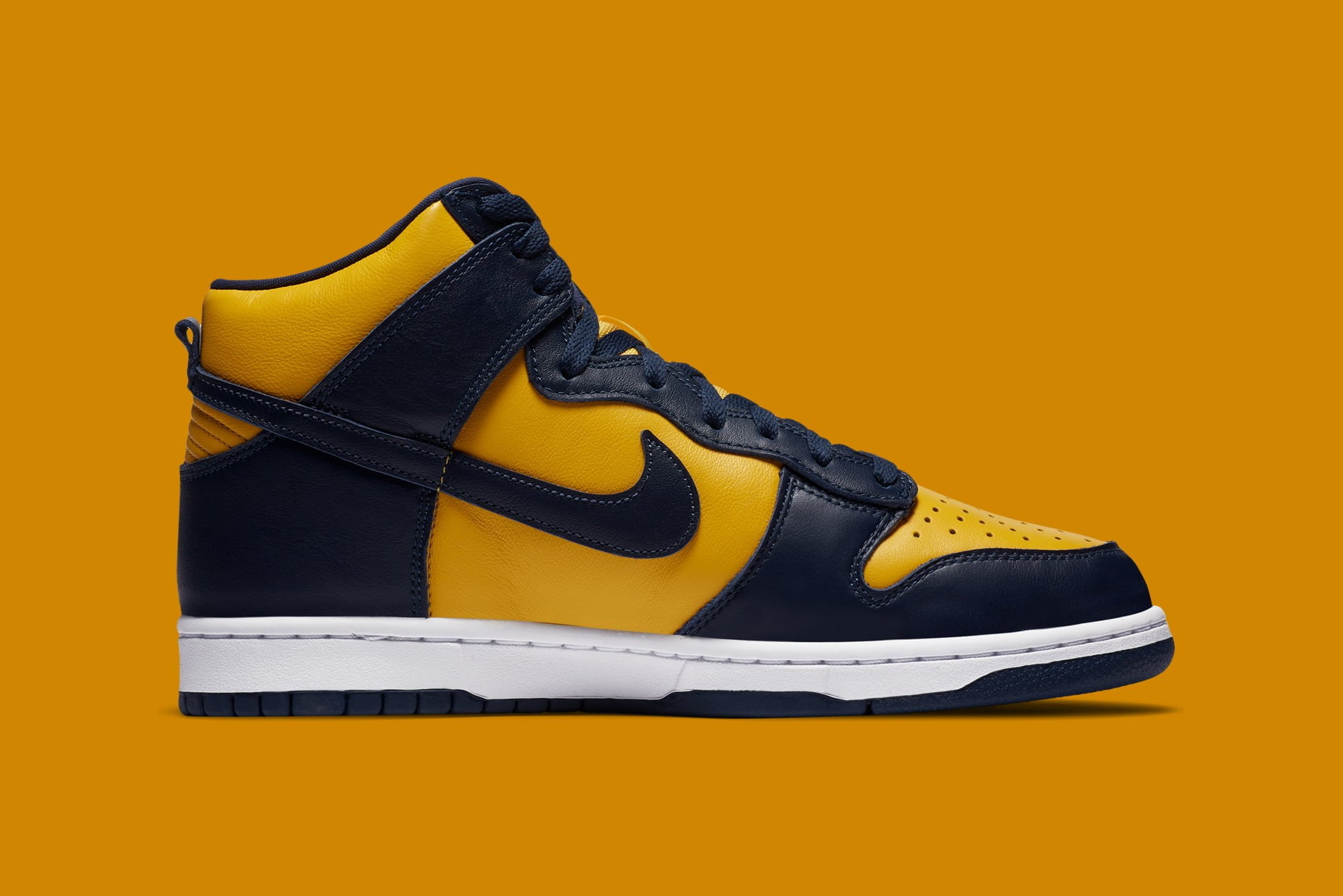 The 2020 edition of the Nike Dunk High SP Retro ‘Michigan brings back one of the OG colorways from Nikes legendary ‘Be True to Your School series from 1985. The design is true to the original, featuring a yellow leather upper with contrasting navy blue overlays at the forefoot, heel, and eye stay. Details include flat woven laces, perforated detailing at the toe box, and a Nike tag atop the lightly padded nylon tongue.