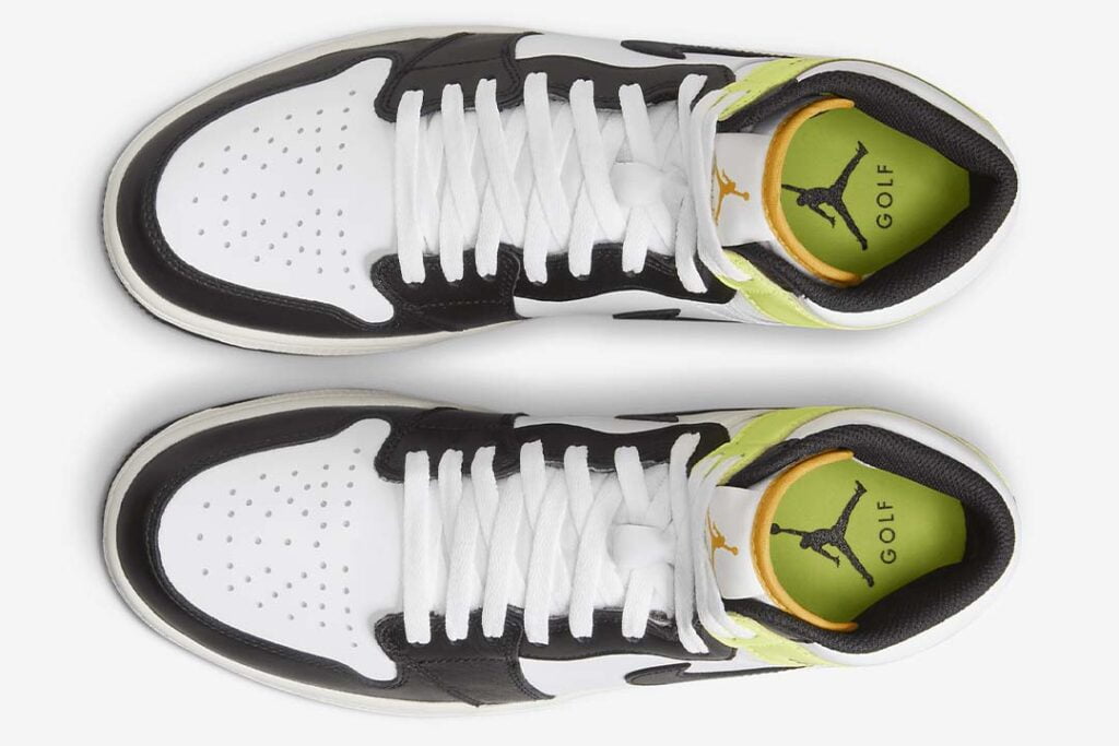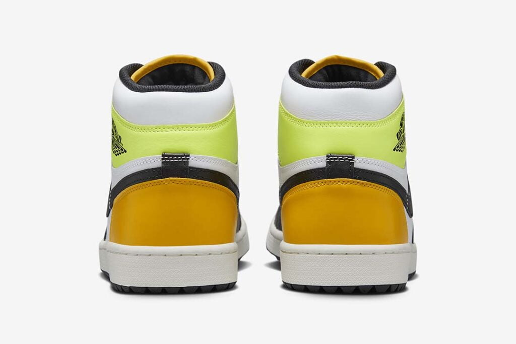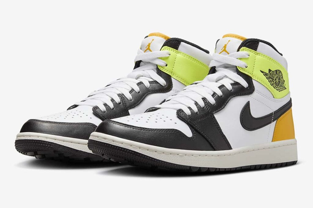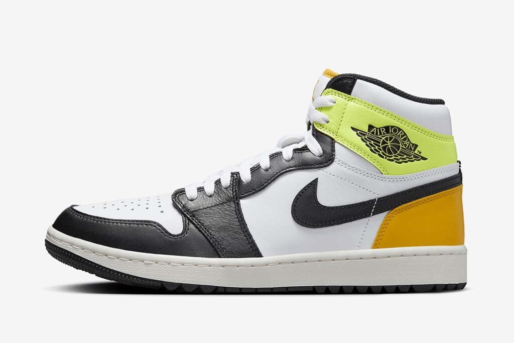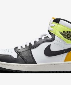 The Air Jordan 1 High Golf Volt Gold is a distinctive fusion that reimagines the classic Air Jordan 1 silhouette specifically for the golf course. This particular model features the vibrant Volt Gold colorway, which stands out with its bold and energetic hues, blending bright yellow with accents of white and black. The upper of the shoe is crafted with premium materials, ensuring both durability and style, while the familiar design elements like the iconic Nike Swoosh, Air Jordan wings logo, and high-top profile are retained, paying homage to its basketball roots. This shoe not only highlights a fashion-forward statement but also provides functional benefits tailored for golfing.