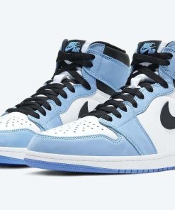 The upper of the Air Jordan 1 High University Blue is composed of a white and black tumbled leather upper with University Blue Durabuck overlays. Following traditional Jordan 1 detailing, a Nike Air woven label is located on the tongue and an Air Jordan Wings Logo is printed on the ankle. A white midsole and University Blue outsole complete rejuvenated classic.