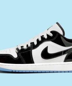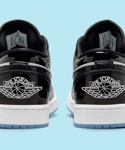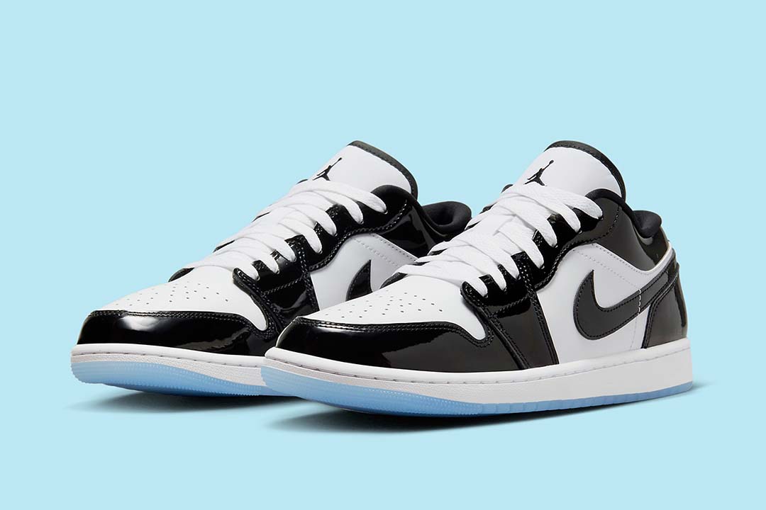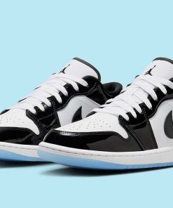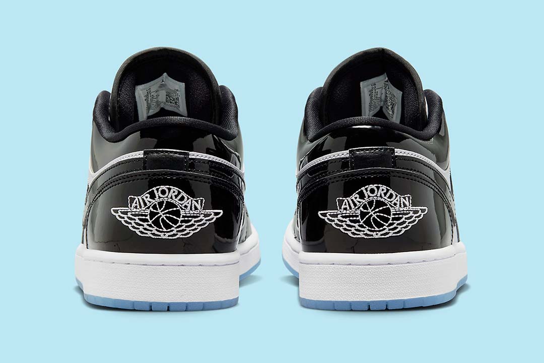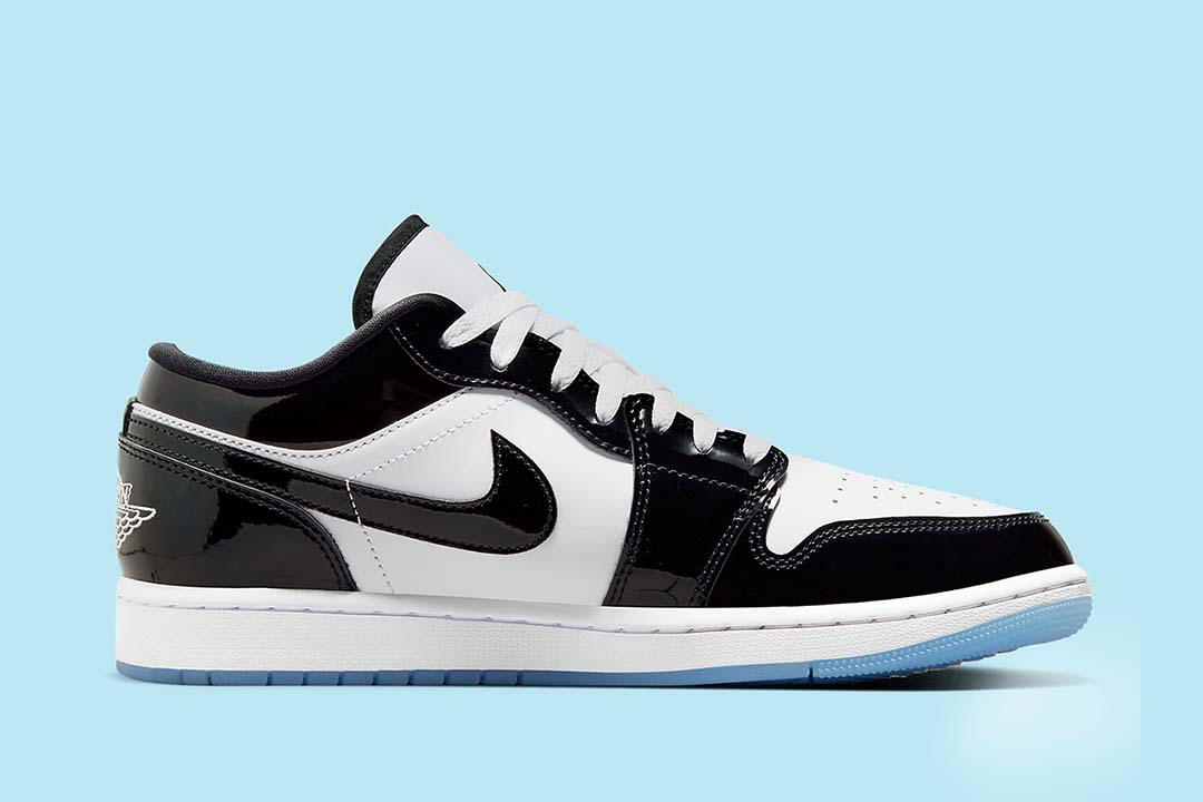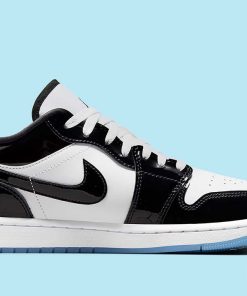 The Jordan 1 Low SE Concords draw inspiration from the Air Jordan 11 Concord, highlighted by the sneakers combination of black patent leather, and white leather uppers. Jordan brand used a translucent blue outsole, and added a white Air Jordan Wings logo placed on the heel of each sneaker.