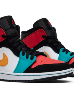 The Air Jordan 1 Mid ‘Multi-Color showcases a design that borrows from Nikes ‘What The concept, bringing together clashing hues to accent a classic Chicago-inspired foundation. The latter is readily seen on the toe and collar, both rendered in black and red. A white leather quarter panel, overlaid with an orange leather Swoosh, is flanked by contrasting pops of Turbo Green and purple.