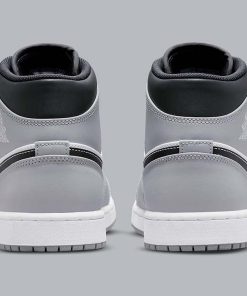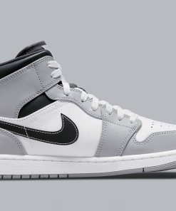 The Jordan 1 Mid Light Smoke Grey Anthracite has toe cap, collar flaps, eyestays, and heel counter fashioned with a buttery “Light Smoke Grey leather. The shoes upper base features a clean white leather that pops out of the toe box and mid-quarter panel. Jordan 1 Mid Light Smoke Grey Anthracite adds a striking contrast with its pitch-black Swoosh. It also features a black shade on the sock liner, tongue, and collar. The white and Light Smoke Grey midsole adds to the overall greyscale look. The shoe features a white Jumpman on the tongue tab and a white “Wings logo on the collar flap.