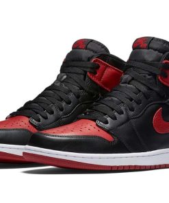 The Air Jordan 1 Bred 2016 featured a black and Varsity Red leather upper with Swoosh overlays and Wings logo detailing at the collar. Vintage-styled Nike Swoosh woven tongue tags add a classic feel. From there, a white and red Air sole completes the design.