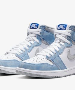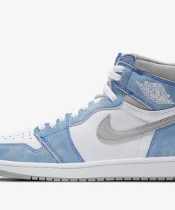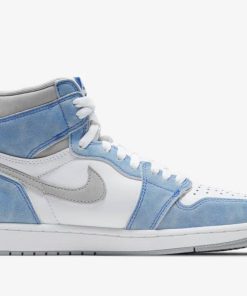 The upper of the Air Jordan 1 Hyper Royal is constructed with white leather and distressed Hyper Royal suede overlays while the Swoosh and panels around the ankle are made with a Light Smoke Grey Durabuck. Consistent with Jordan 1s of the past, a classic white Wings logo appears on the lateral ankle. A blue woven Nike Air label stitched on the tongue, a white midsole, and a Light Smoke Grey outsole add the finishing touches to this retro design.