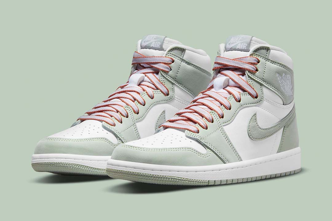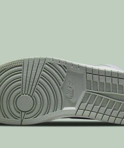 The womens Air Jordan 1 High Seafoam-W arrives in a smooth white leather construction with Seafoam Durabuck overlays and Swooshes. On the laces, crisp bronze trimming stands out against the designs subtle coloration. The womens Air Jordan 1 High Seafoam-W released in August of 2021