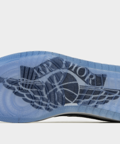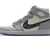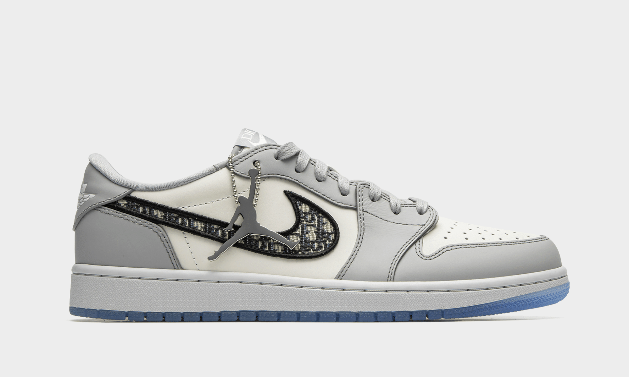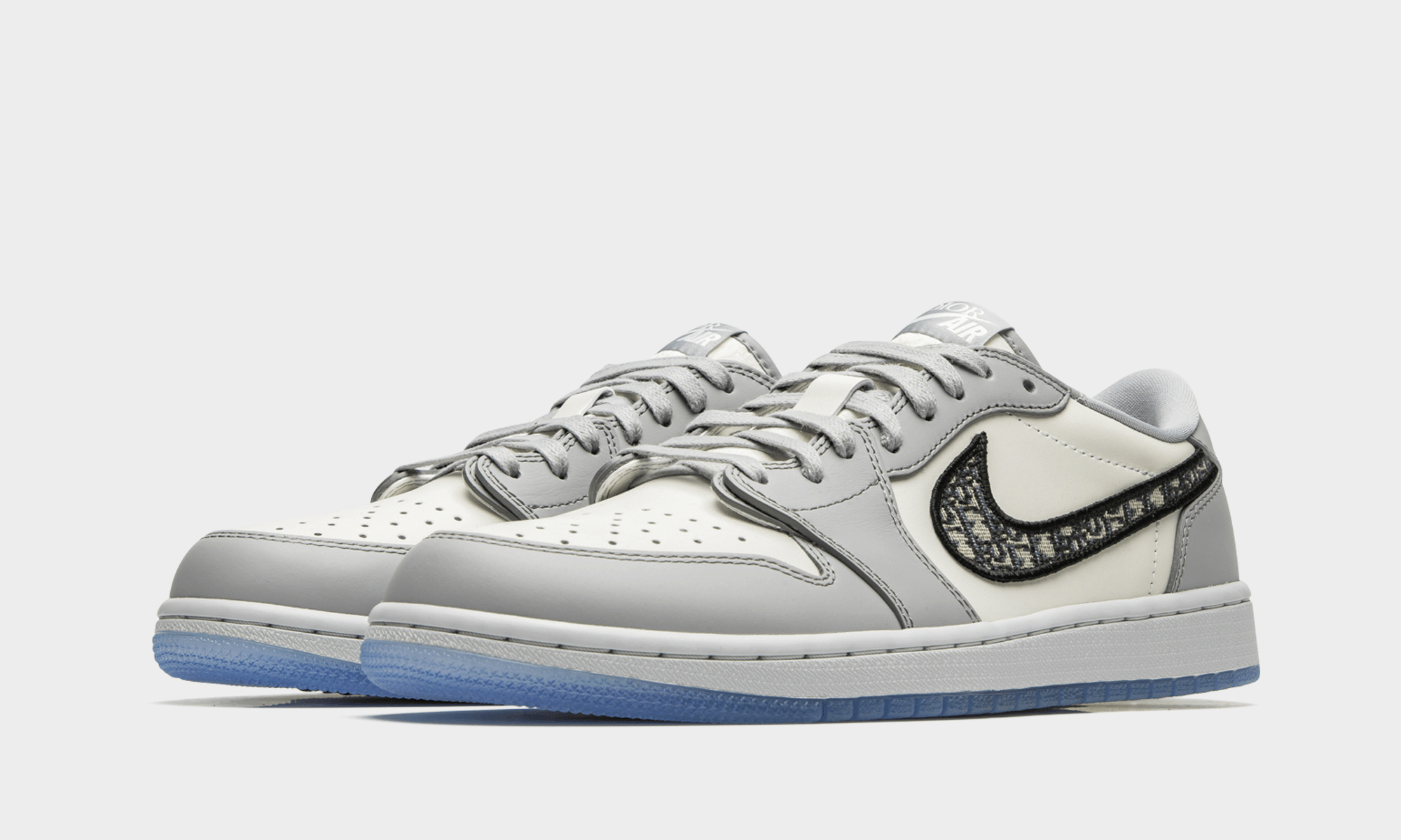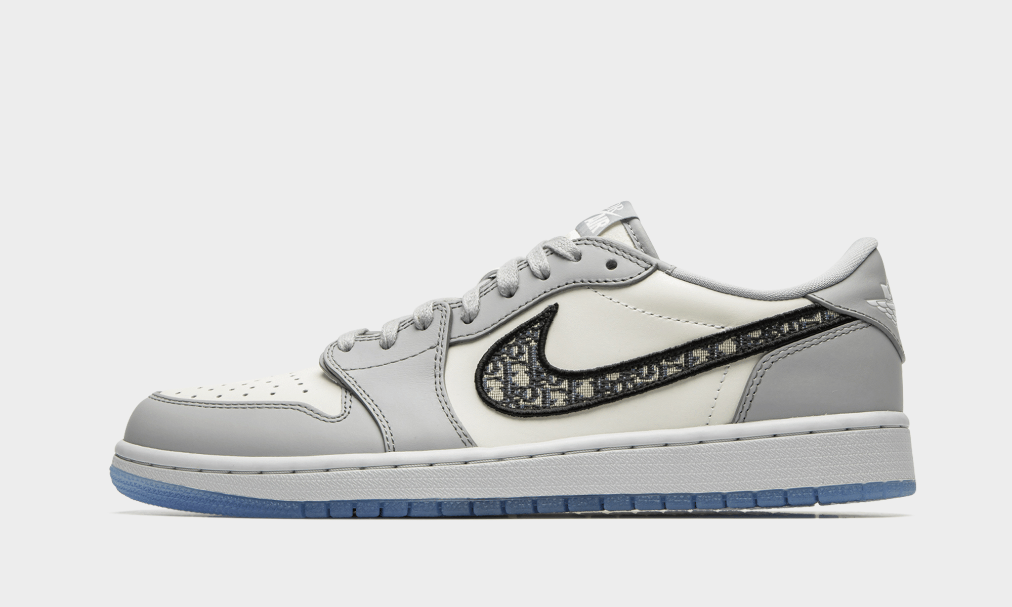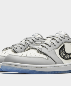 This Jordan 1 Retro Low is composed of a white and grey leather upper with traditional Dior monogram print Swoosh. Co-branded icy translucent soles, Dior branded tongue and Wings logo, and a silver Air Dior hangtag completes the design.