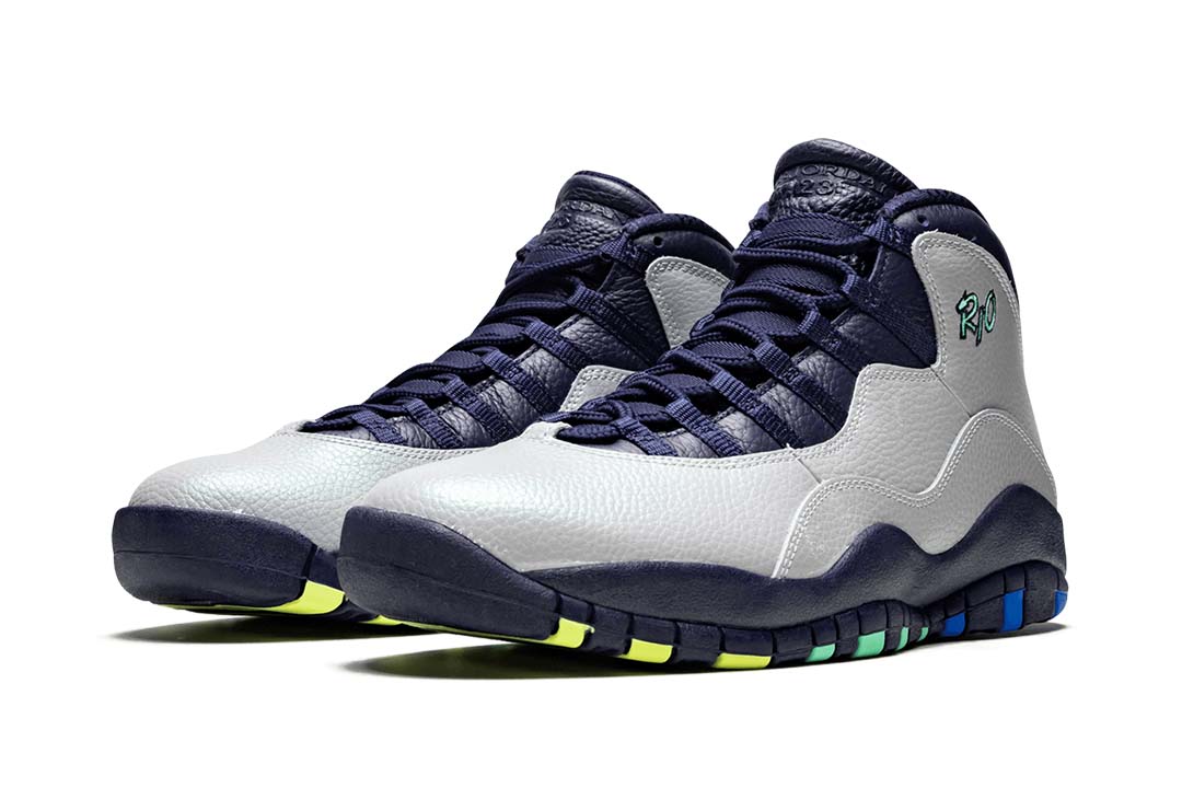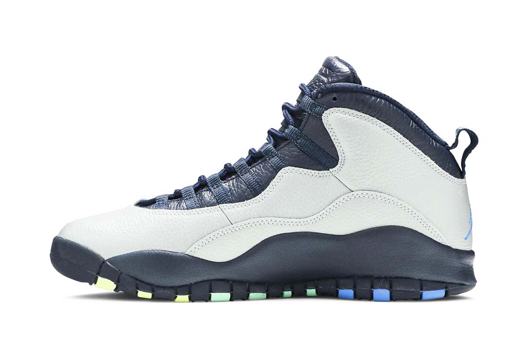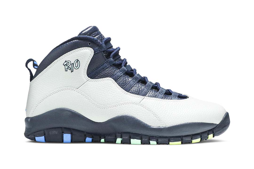 Released ahead of the 2016 Olympic Games in Rio de Janeiro, the Air Jordan 10 Retro ‘Rio gives the nod to the host city. Park of a City Pack, the shoe features a subdued Wolf Grey pebbled leather upper complemented by Obsidian throughout. The bright ‘Rio callout on the ankle adds a pop of color, but the Brazilian inspiration is most noticeable on the outsole, where the signature bar design features a tropical gradient.