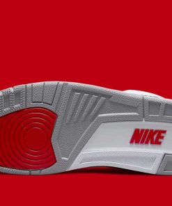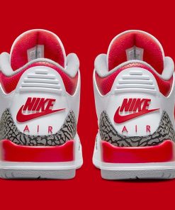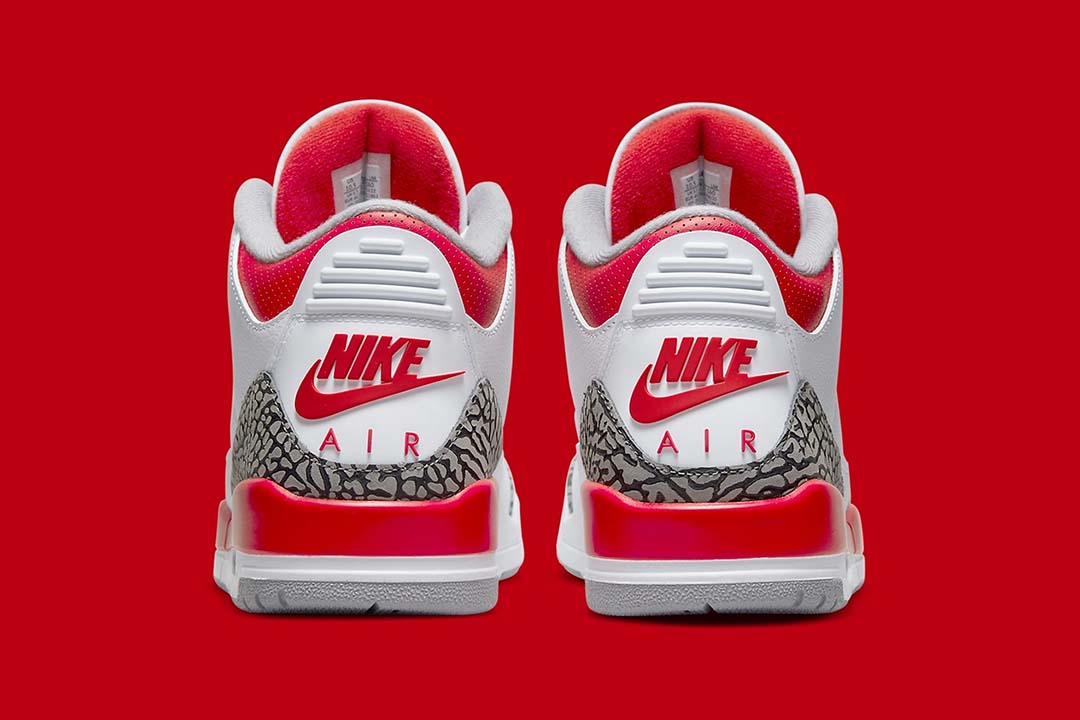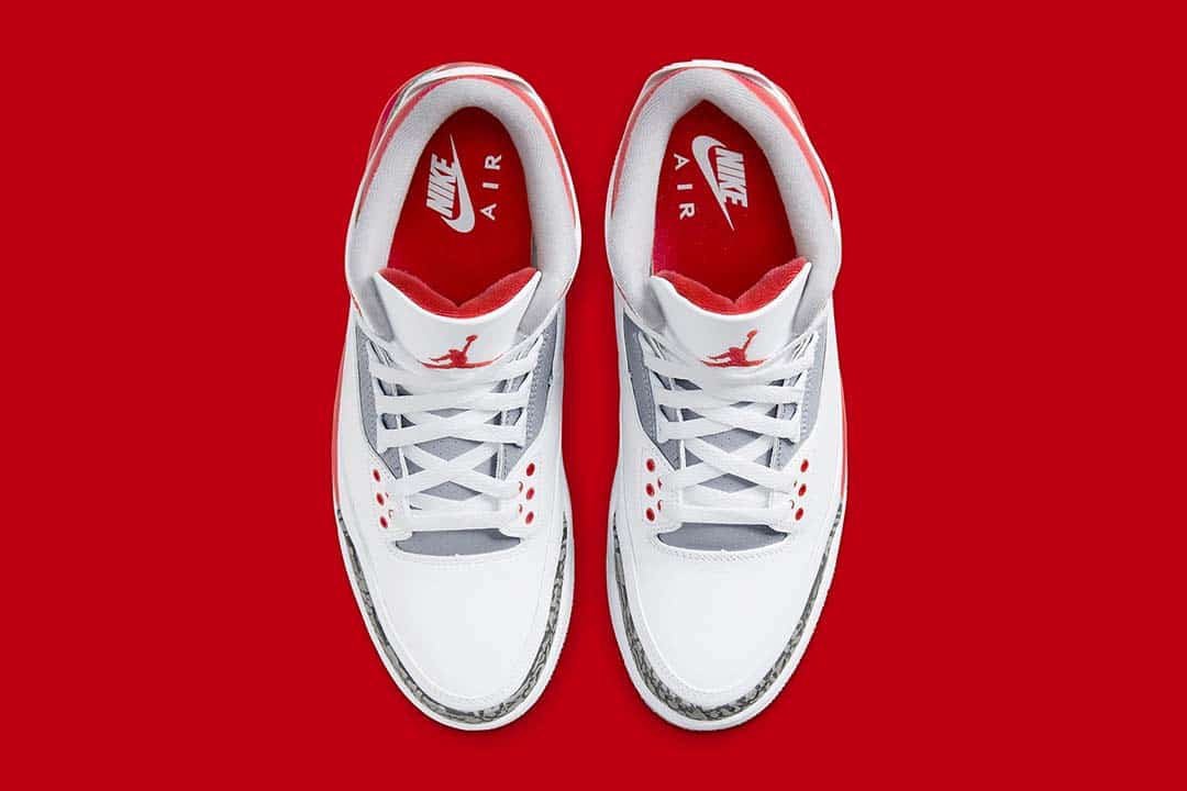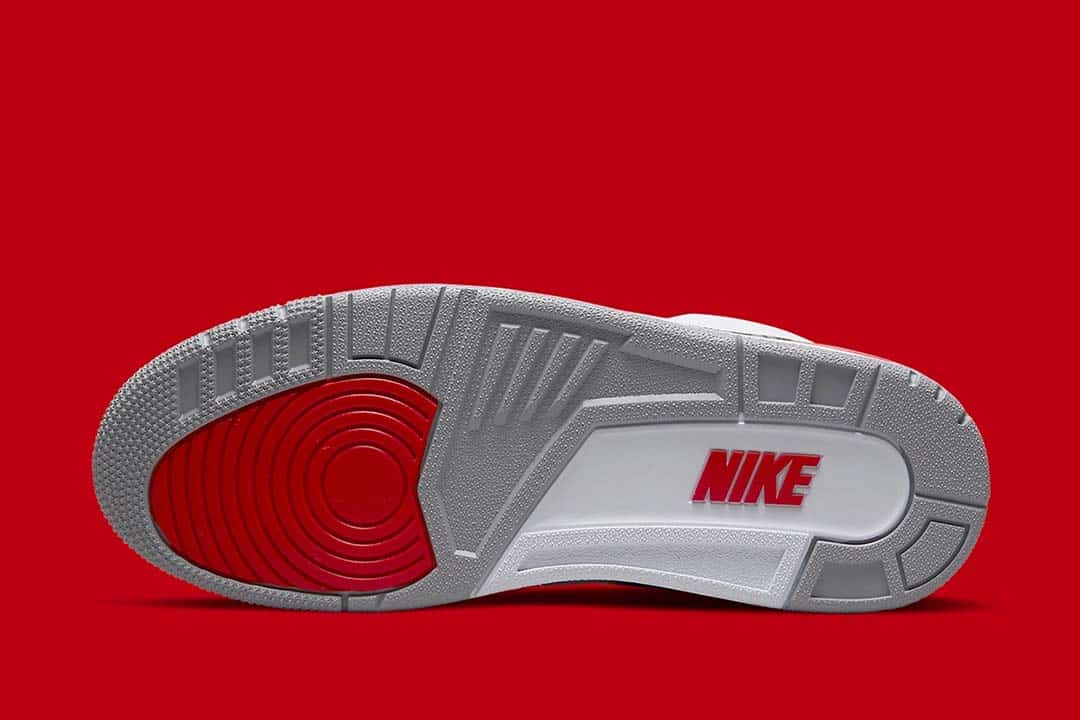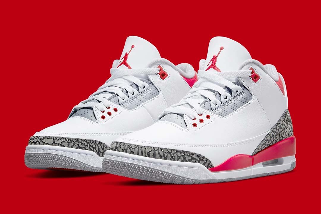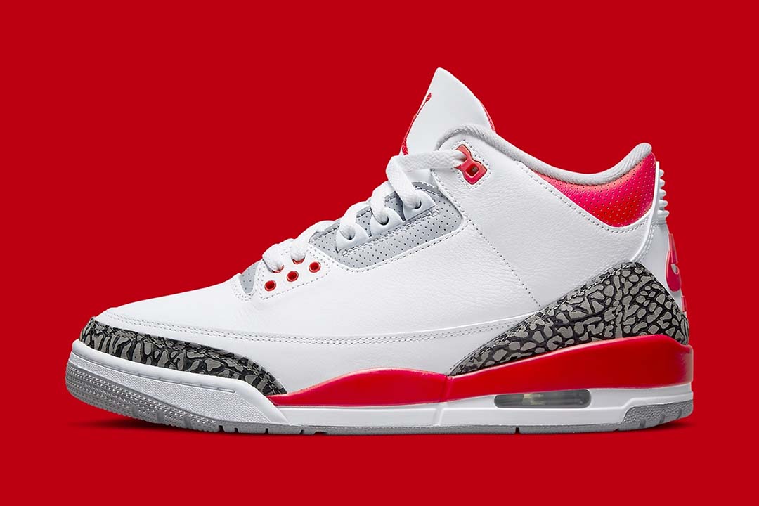 A much-anticipated revival, the Air Jordan 3 Fire Red (2022) brings back the Nike Air, placing the logo right atop the heel just as it appeared in 1988. Adjacent, white leathers comprise the brunt of the upper, while light greys and the titular red dress the accents adjacent, such as the embroidered Jumpman, perforated trims, and eyelets. And while a relatively faithful homage to the OG, not all is exact, as the Cement Print has been slightly reworked.