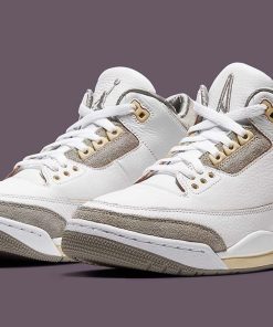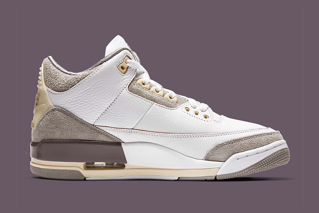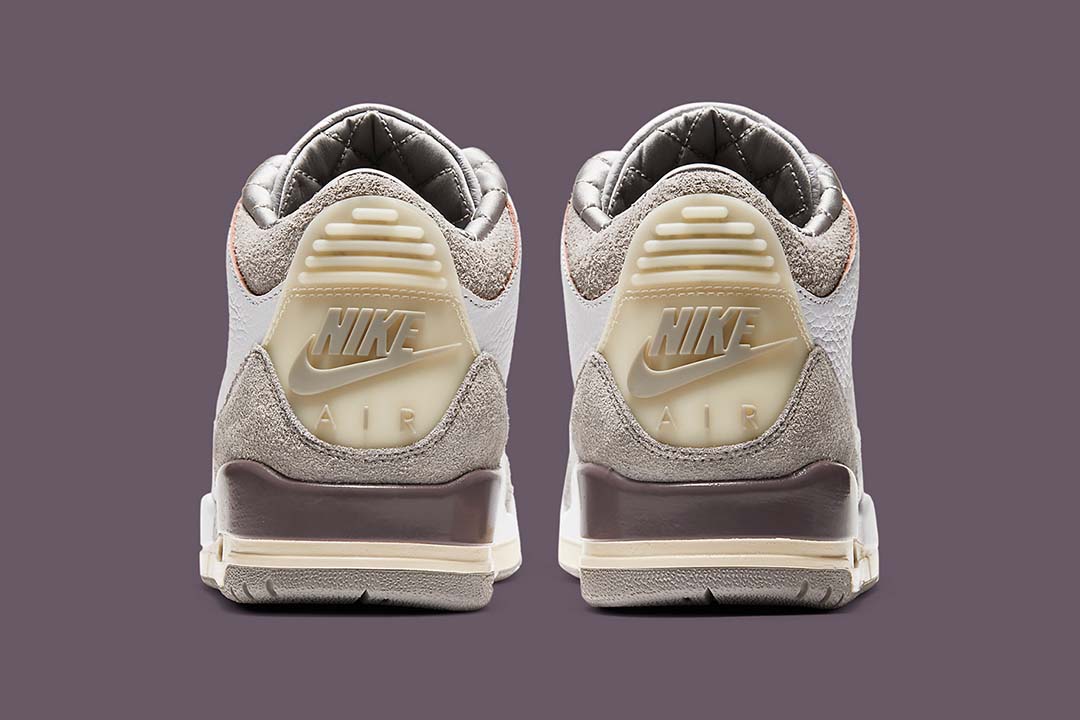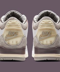 The Air Jordan 3 A Ma Mani??re arrives featuring a white tumbled leather upper with Medium Grey suede on the toe wrap, eyestay, heel wrap, and ankle. Each panel of leather on the upper has a raw trim, revealing a natural, tan edge. To provide a vintage aesthetic, the eyelets, heel tab, and lower portion of the midsole are yellowed. From there, the tongue on the left sneaker features an embroidered A Ma Mani??re logo, while the right features a Jumpman logo. Quilted satin lining on the interior of the shoe adds an element of luxury. A white, Violet Ore, and Medium Grey sole with a classic Air unit in the heel completes this retro look.