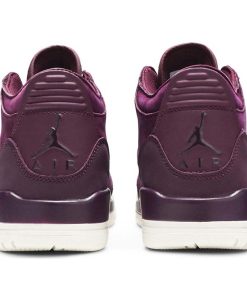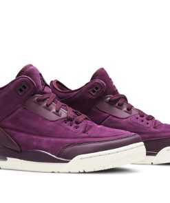 In addition to a modestly deconstructed build that sees less padding on the collar, the upper is finished in a monochromatic design. The suede upper is dressed in a wine-red Bordeaux, as are the smooth leather overlays that replace the AJ3s signature elephant print. Off-White Sail provides contrasting color on the midsole.