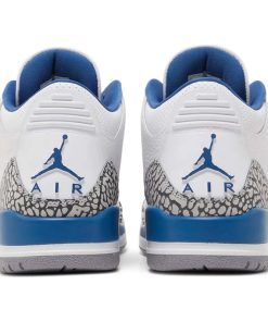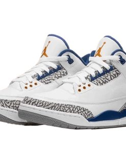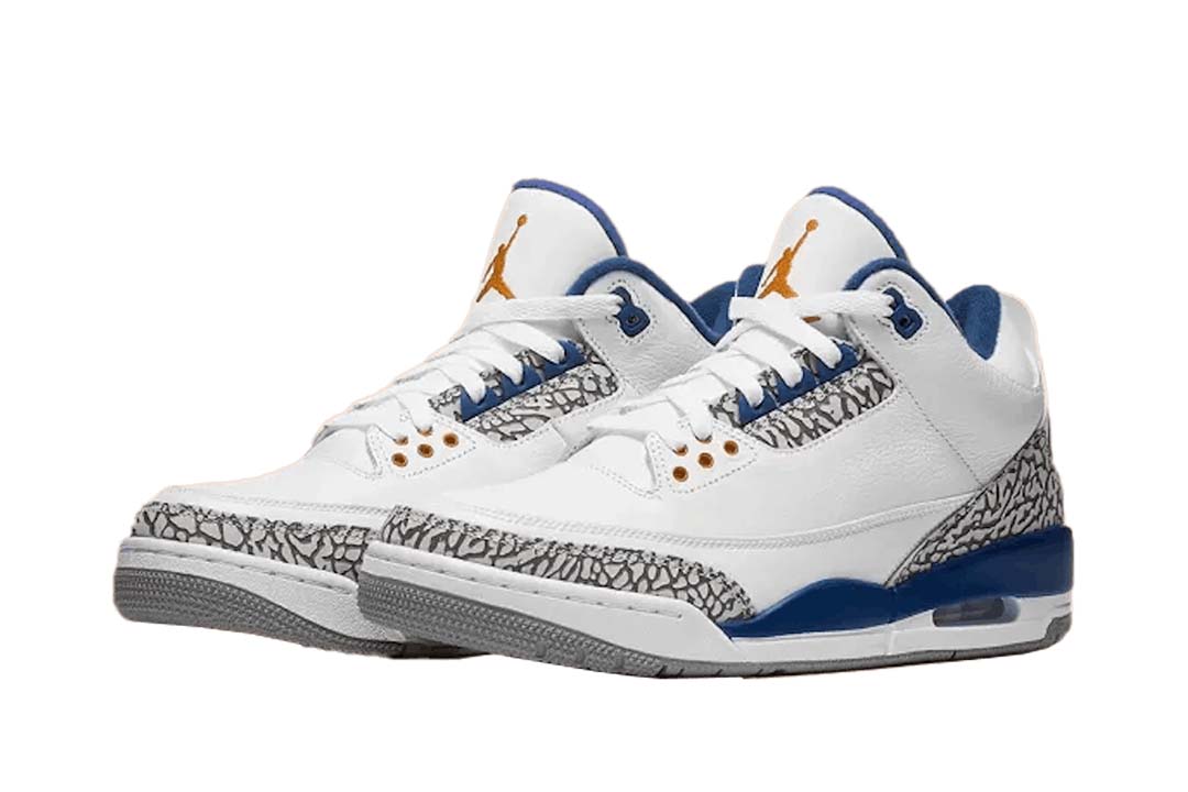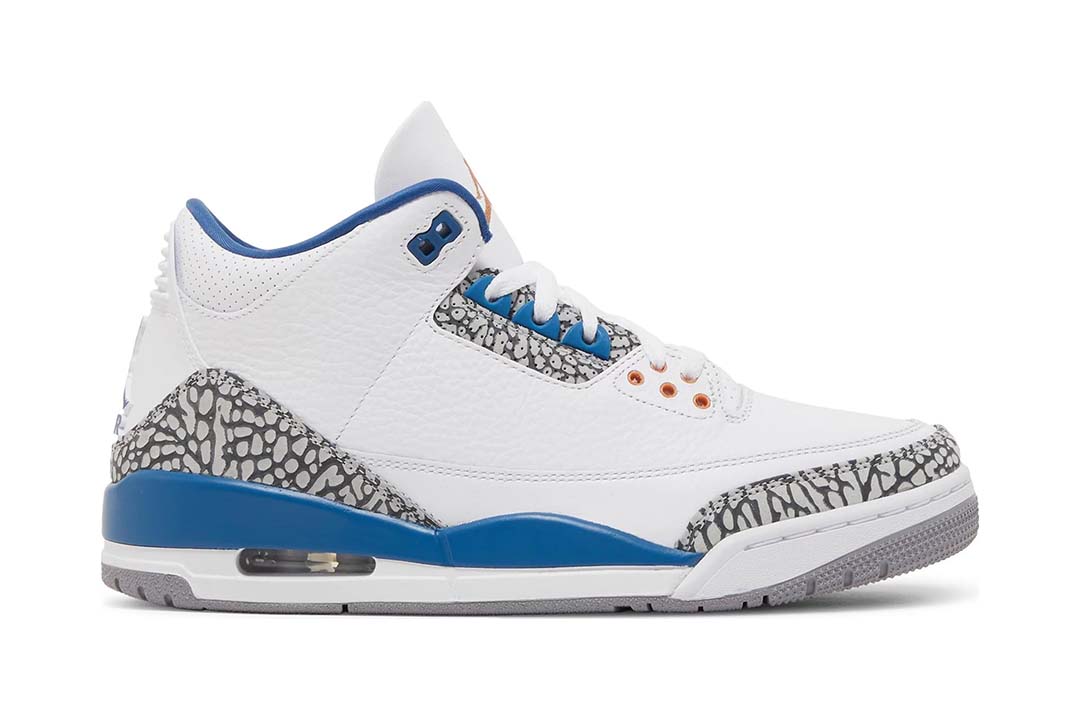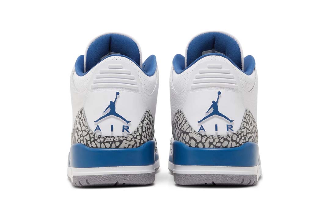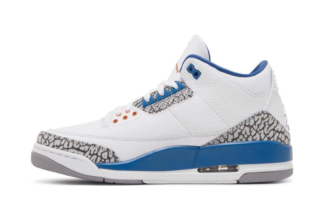 Likened to the True Blue 3s upon reveal, the Air Jordan 3 Wizards is a Retro of a more obscure Player Exclusive, which was originally seen in 2001. Inspired by the color palette of the Washington teams uniform, the shoe is clad predominantly in white, while blue and copper accents sit adjacent. The latter is applied to the Jumpman logo as well as the forward-most eyelets, complementing the cool tone across not only the adjacent grommets but also the midsole and lining. Cement Print, then, finishes the colorway across the toe cap, the heel counter, and the profiles perforated paneling.