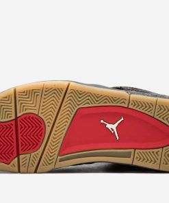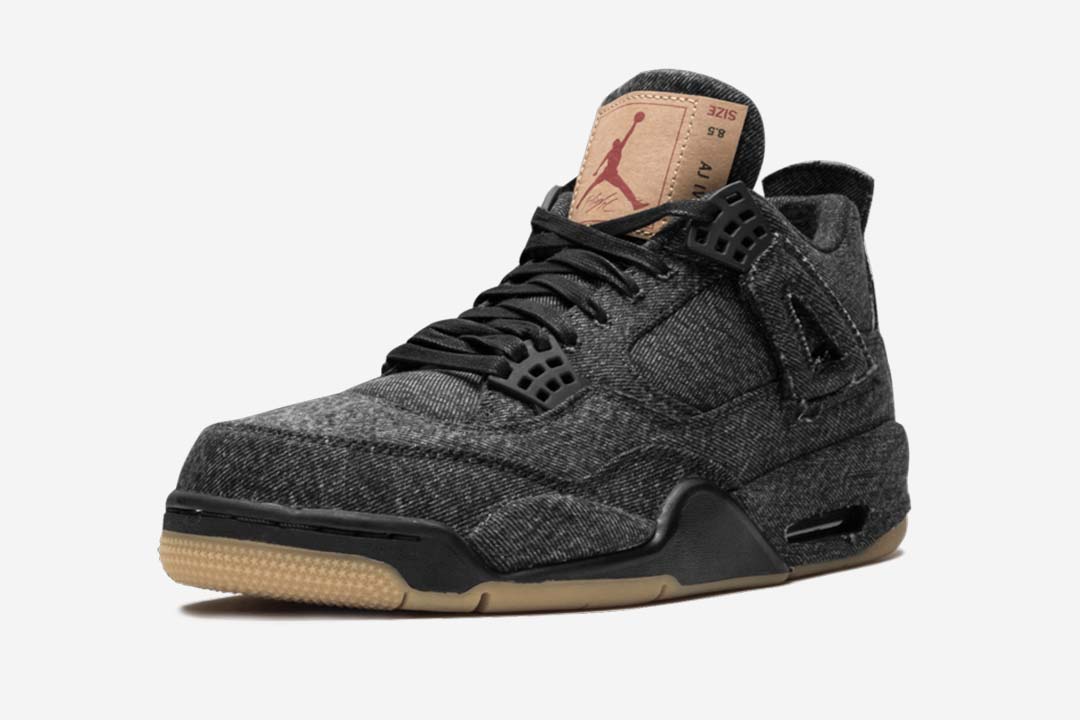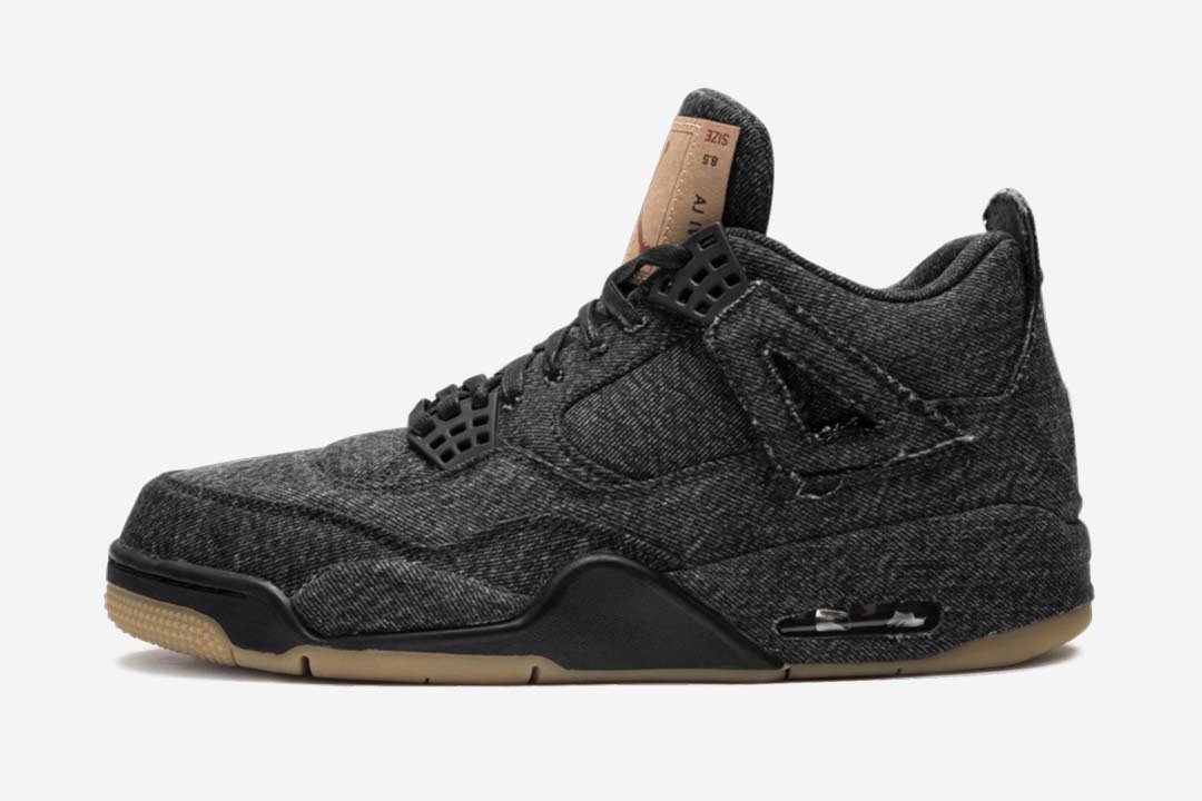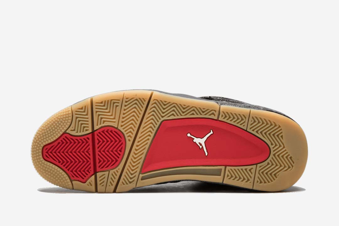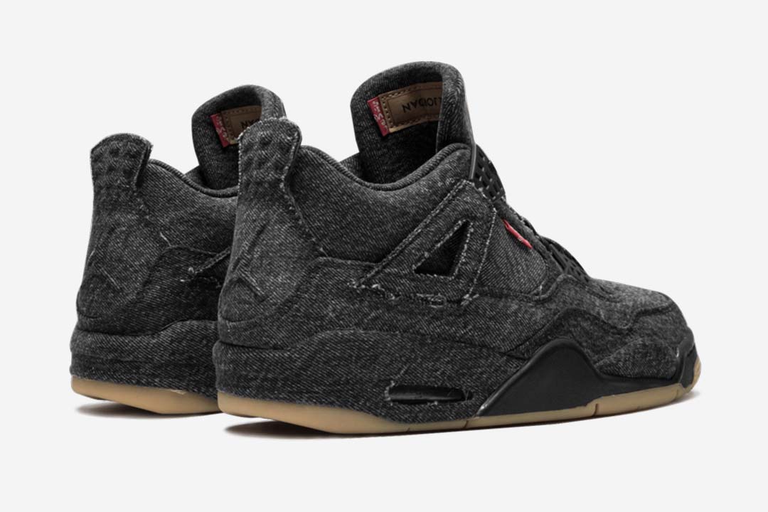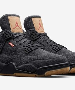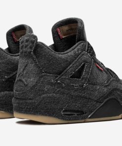 The Levis x Air Jordan 4 ‘Black Denim overhauls the classic silhouette with materials and details traditionally associated with the iconic American denim brand. In addition to the black denim that covers the upper and midsole, the shoe is accented with Levis signature red tab on the quarter panel. Another Levis trademark ?C the ‘Two Horses paper patch ?C is rebranded with a red Jumpman logo and positioned on the tongue, featuring tan coloring thats matched by a gum rubber outsole.