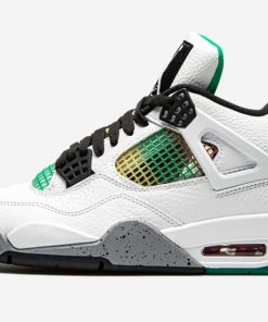 Its no coincidence that the womens Air Jordan 4 Retro Lucid Green Rasta (W) features the colors of the Jamaican flag??black, green, and bright yellow. Nike released the Jordan 4 Retro Lucid Green Rasta (W) in 2020 to celebrate the annual Jamaican Carnival festival. This shoe features vibrant gradients that blend red into yellow and yellow into green. Hard mesh, white leather, and a textured sole create an image of a tough, sturdy shoe thats ready to hit the streets.