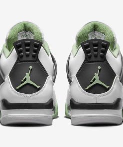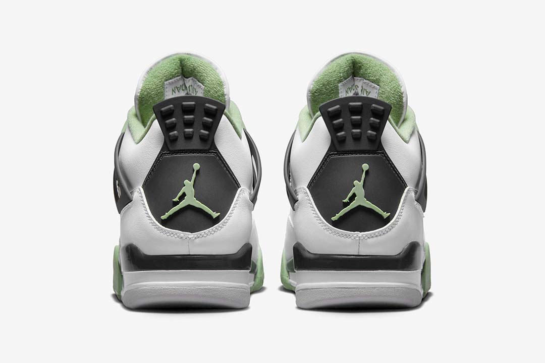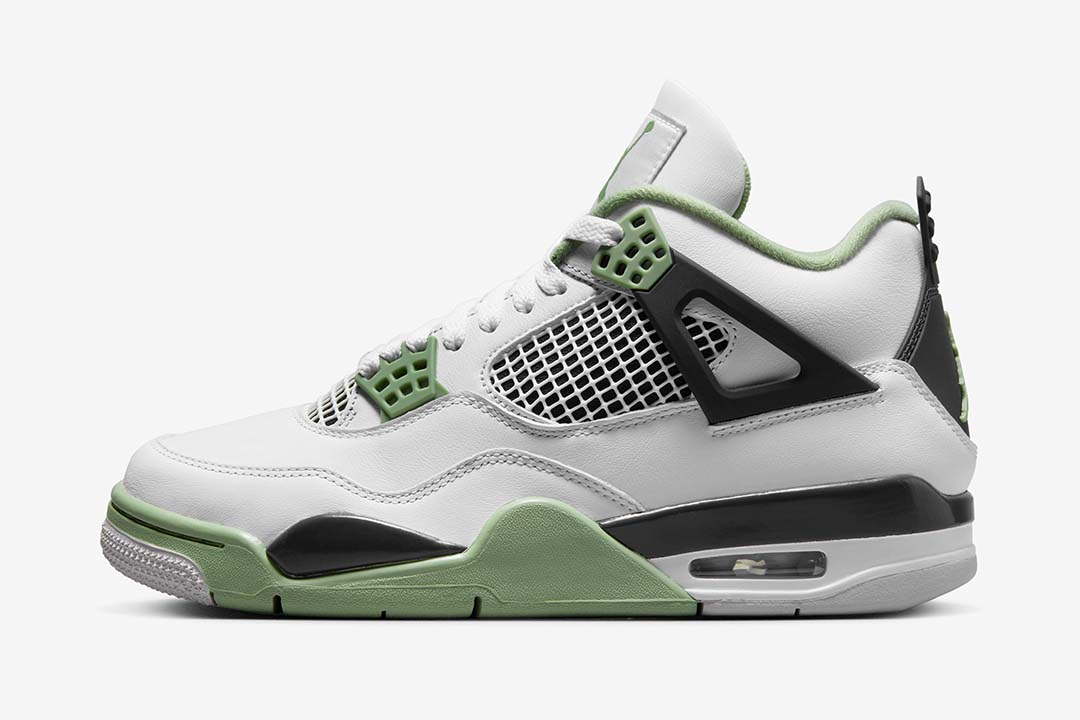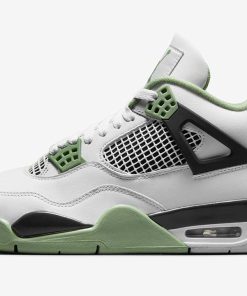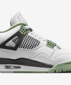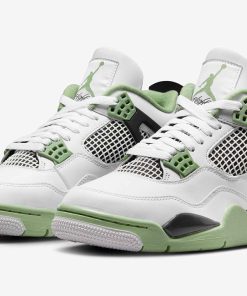 The Air Jordan 4 Seafoam (W) received the same color-blocking treatment as the Jordan 4 Fire Red, and Jordan 4 Military Blue. The Seafoam Air Jordan 4 features a smooth white leather upper, with a black midsole and heel tab. Seafoam green eyelets, mudguard, sock lining, and tongue and heel logos, add a layer of contrast to the sneaker.