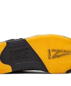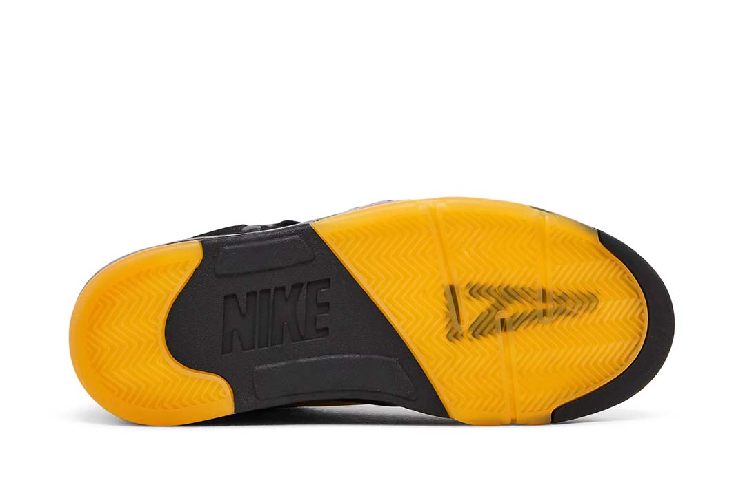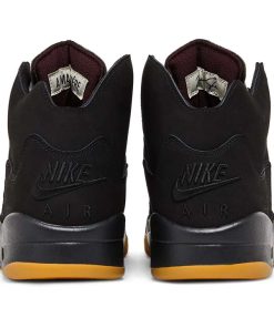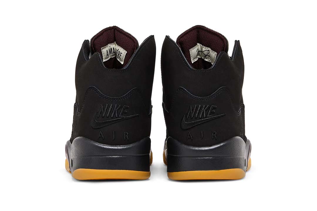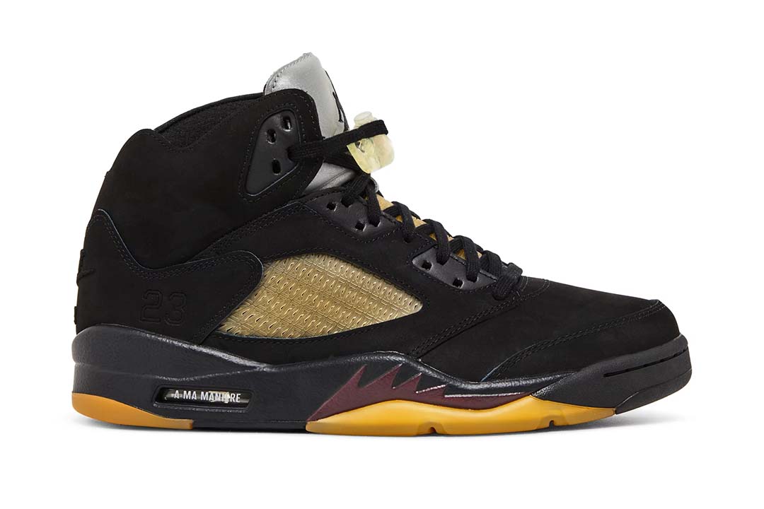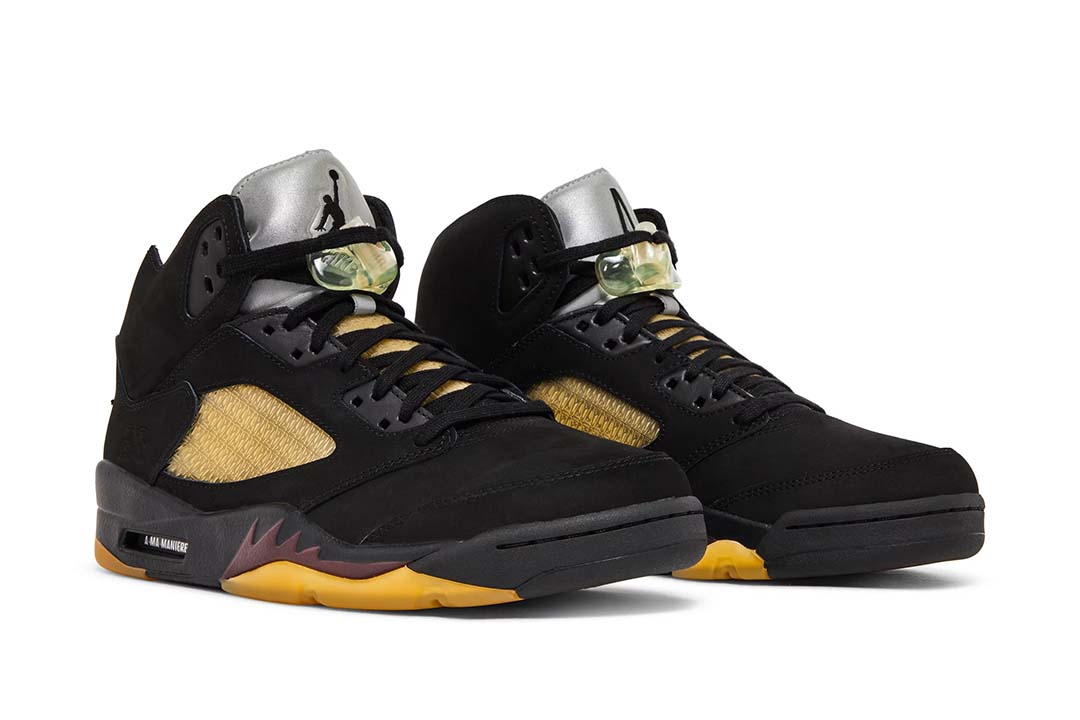 The A Ma Mani??re x Air Jordan 5 Retro ??Dusk reunites the creative partners on a two sneaker collaborative pack. This pair carries a black nubuck upper, updated with a slimmed-down collar and pre-yellowed quarter panel netting formed with an interlocking series of A Ma Mani??res signature ??A logo. ??Nike Air branding is embroidered on the back heel in tonal fashion, while silver reflective tongues display mismatched Jumpman and A Ma Mani??re branding. The sneaker sits atop a matching black polyurethane midsole with shark-tooth detailing in a dark burgundy hue. A pre-aged translucent rubber outsole featuring the Atlanta-based retailers logo provides durable traction underfoot.