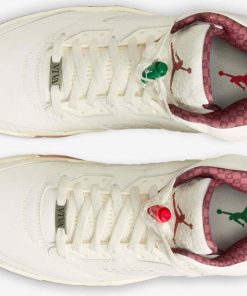 The Air Jordan 5 Retro El Grito Sail celebrates the vibrant heritage and history of Mexican independence. Inspired by the El Grito de Dolores, the famous call to action by Father Miguel Hidalgo on September 16, 1810, this sneaker pays tribute to Mexicos fight for freedom. The sail leather upper is intricately laser-etched with cultural symbols on the heel panel, tongue, and mudguard. The laces feature custom lace tags that read “VIVA, and the lacelocks incorporate red and green accents, honoring the colors of Mexicos flag.