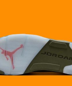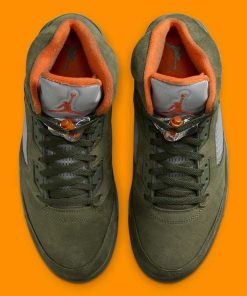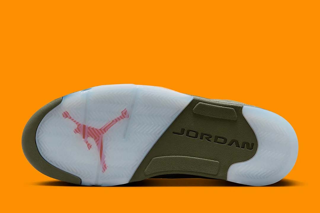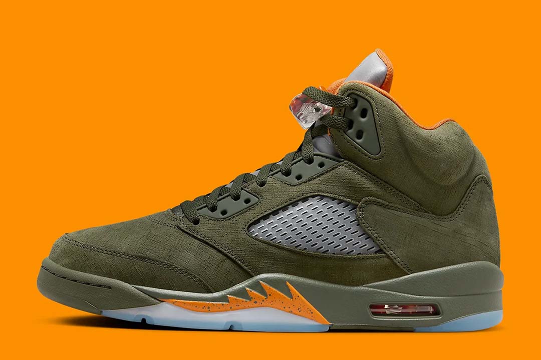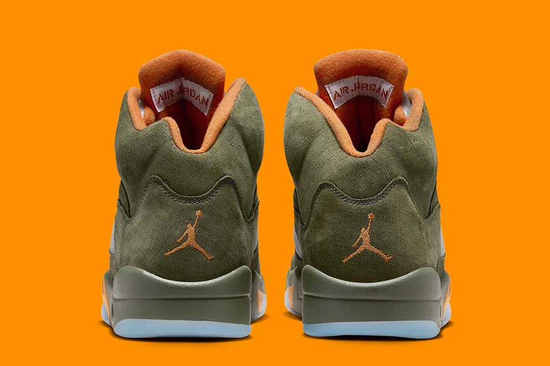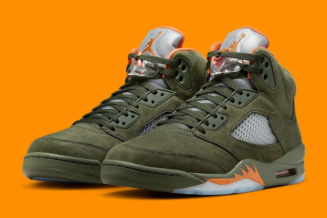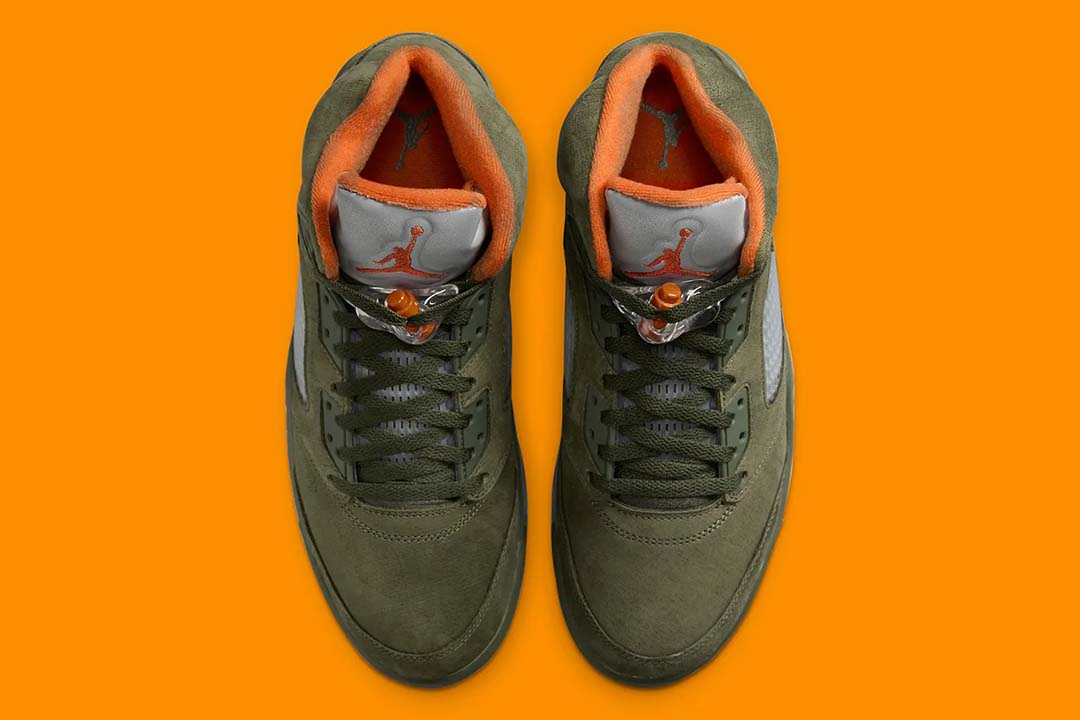 The upcoming 2024 Air Jordan 5 Olive features the same textured suede uppers and orange interior lining to capture that Flight Jacket aesthetic championed by Undefeated, although these have no official connection to the boutique.