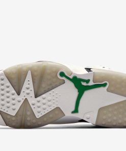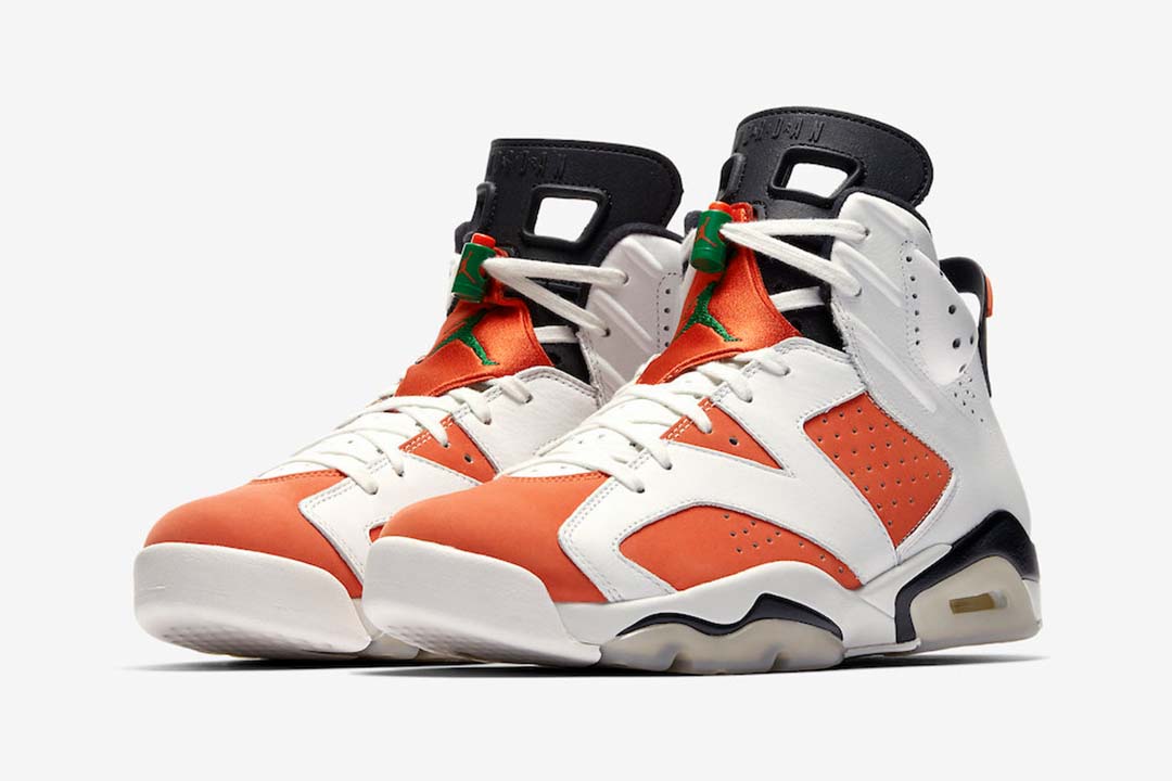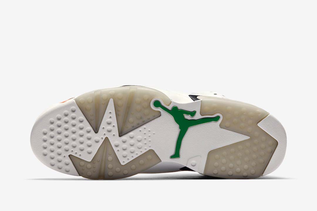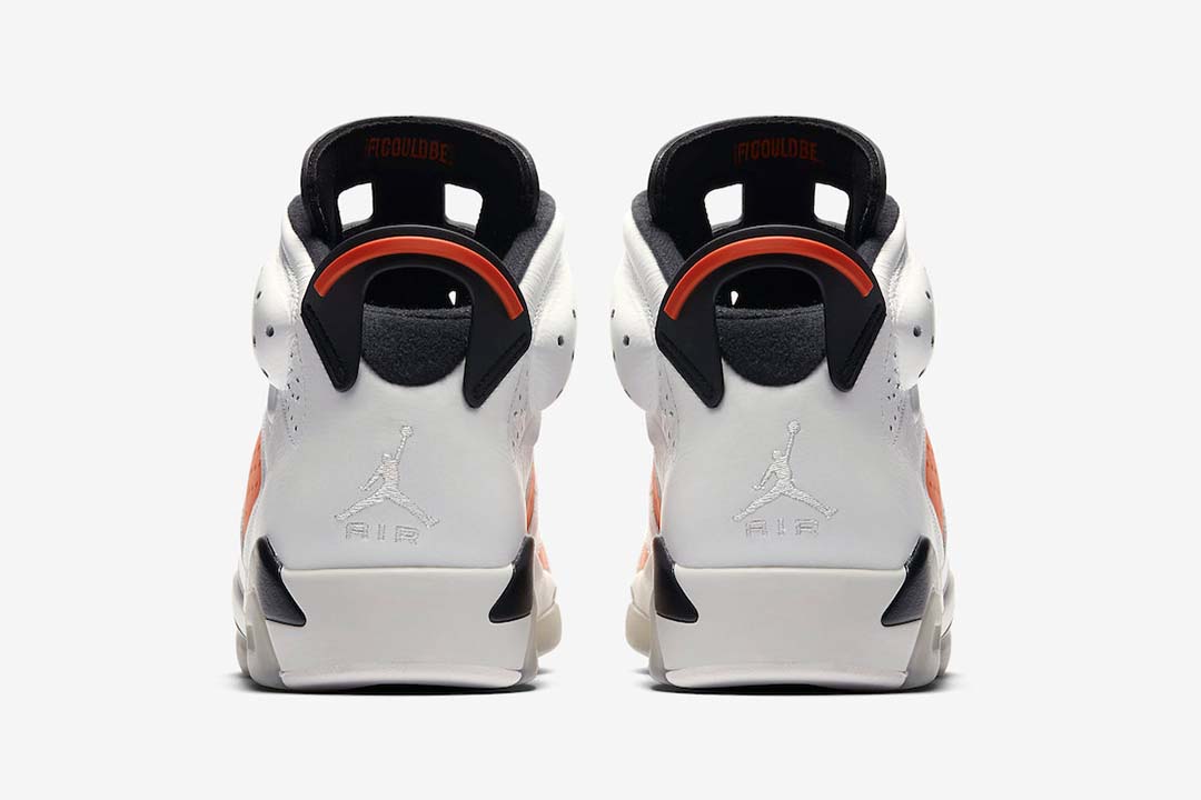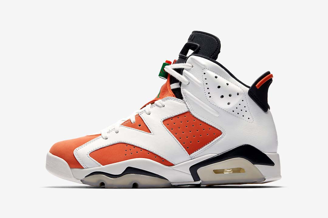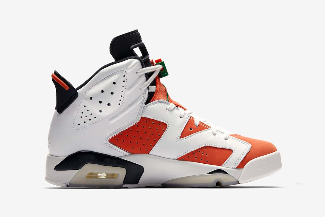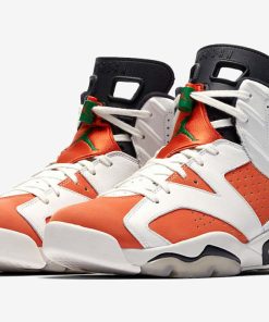 The Air Jordan 6 Retro ‘Gatorade pays tribute to Michael Jordans 1991 ‘Be Like Mike Gatorade commercial. The shoe features the same color blocking as the OG ‘Carmine colorway, with a white leather upper, Gatorade-themed Team Orange accents, and a green lace lock. The spots slogan ?C If I could be ?C also hits up the inner tongue. The ‘Gatorade dropped with a ‘Green Suede Gatorade colorway in December 2017.