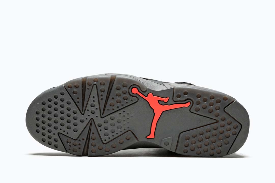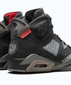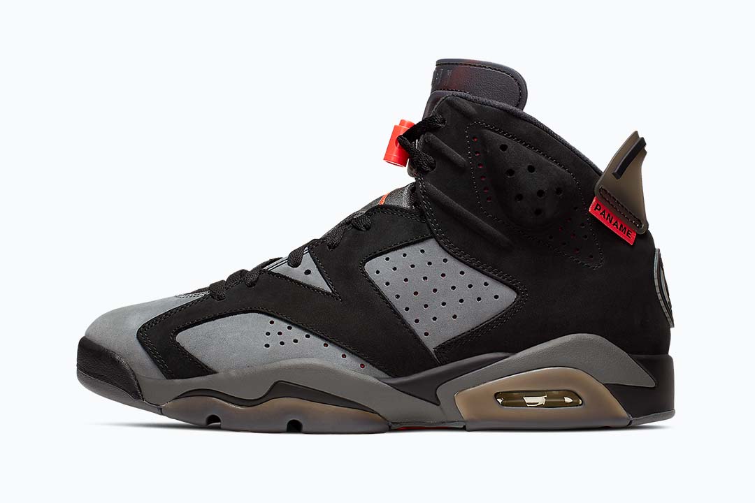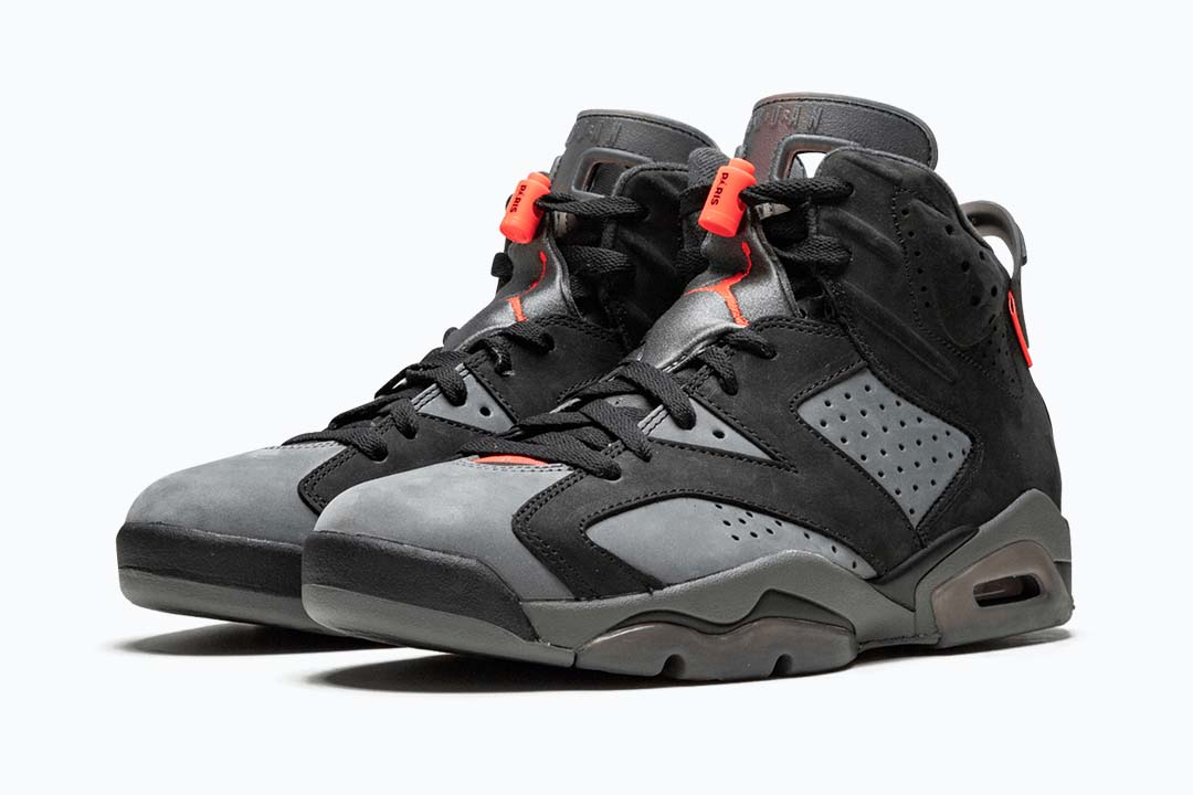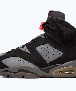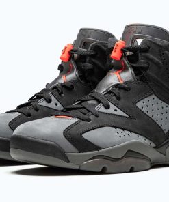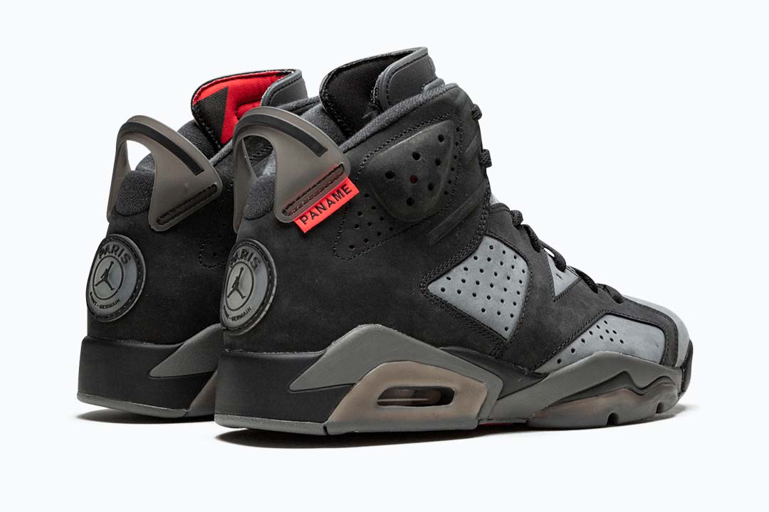 Iconic French soccer club Paris Saint-Germain teamed up with Jordan brand to create the Paris Saint-Germain x Air Jordan 6 Retro ‘Iron Grey. The shoes nubuck upper is finished in black and Iron Grey, with Infrared 23 accents on the Jumpman branding, lace toggle and heel pull-tab. The heel sports a hybrid logo, with ‘Paname appearing on the flag near the ankle. Visible Air in the heel provides cushioning.