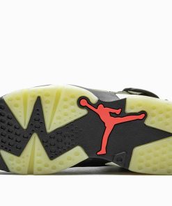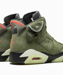 Trailing the buzz of their recent collaborations, Travis Scott and Jordan Brand team up once again for the Jordan 6 Retro Travis Scott. This is the fourth Air Jordan silhouette that Cactus Jack has touched. This sneaker made its mainstream debut when Travis rocked them on stage during his Super Bowl LIII performance and the rest is history.This AJ 6 features an olive upper with black detailing and red contrasting accents on the tongue and lace locks. A side cargo pocket is displayed on the collar, giving this sneaker a design modification that makes it the first of its kind. A sail midsole, glow-in-the-dark translucent outsole, 3M detailing and both Nike Air and Cactus Jack branding on the heel completes the design. These sneakers released in October of 2019