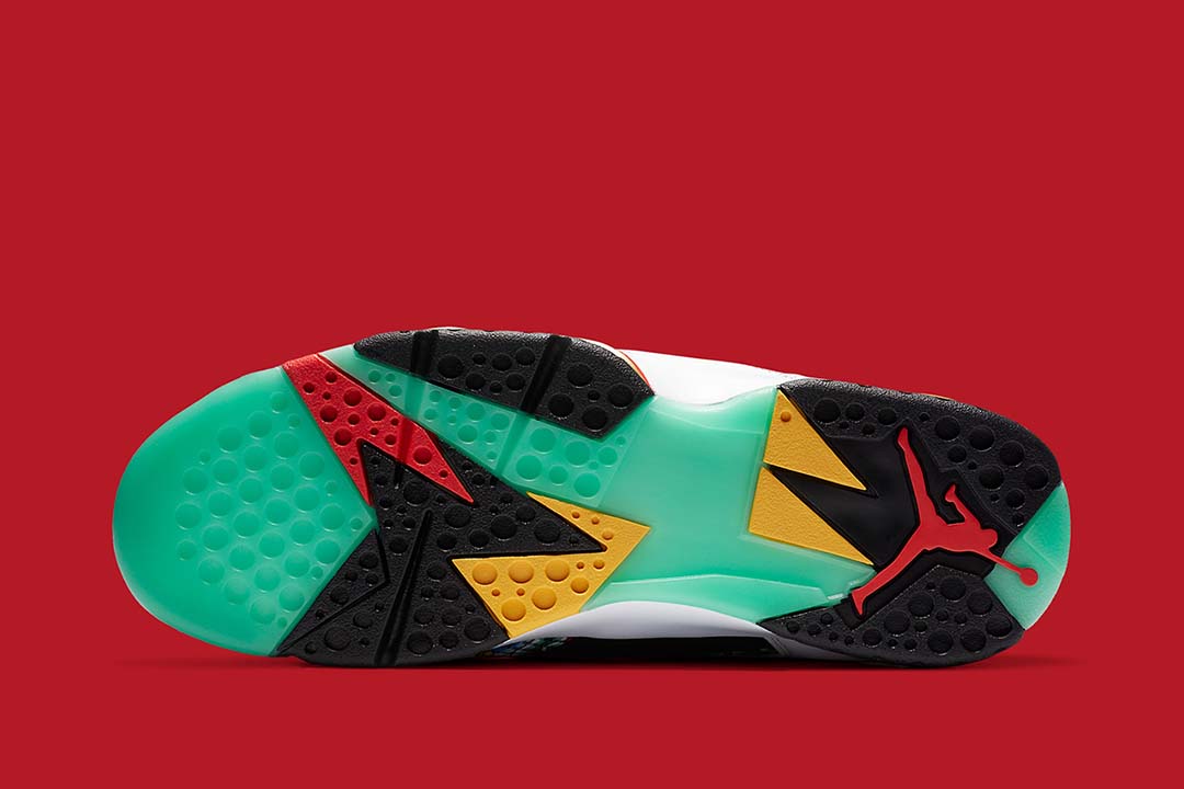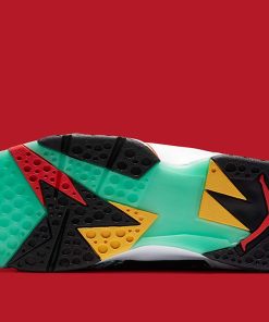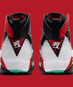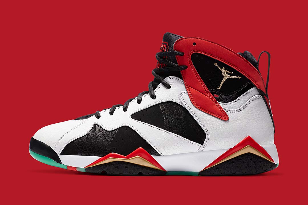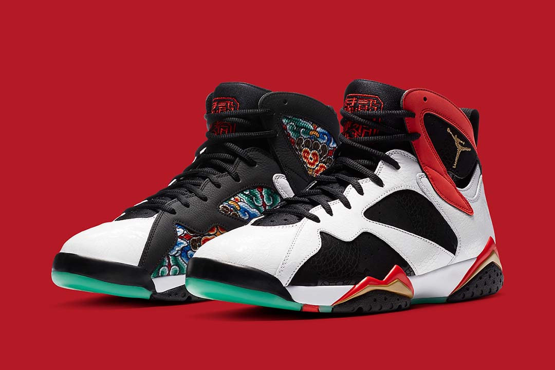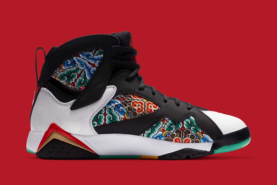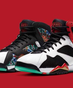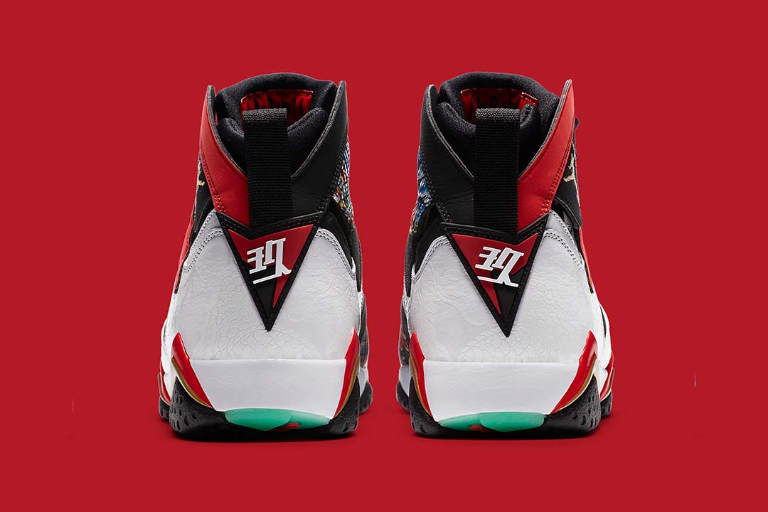 Packaged in a special limited-edition box, the Air Jordan 7 ‘Greater China features an asymmetrical design inspired by Beijings Forbidden City. The lateral side features tonal dragon graphics atop black and white paneling, while the opposite side showcases vibrant cloud graphics with contrasting black leather overlays. Chinese characters reference MJs name and number atop the tongue, along with his 92 Olympics jersey number on the heel badge. Underfoot, the rubber outsole adds glow-in-the-dark elements for an eye-catching finish.