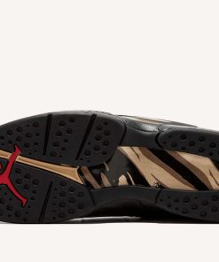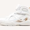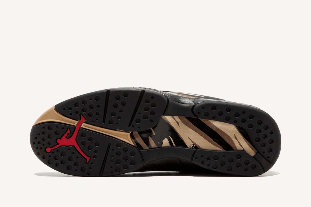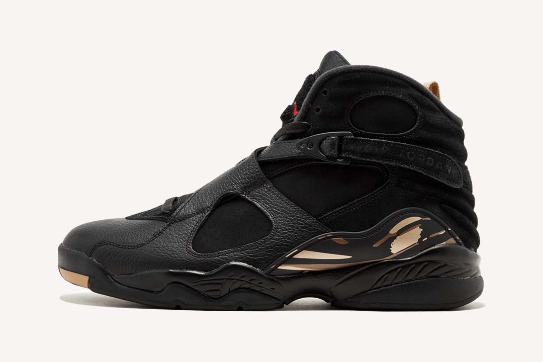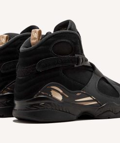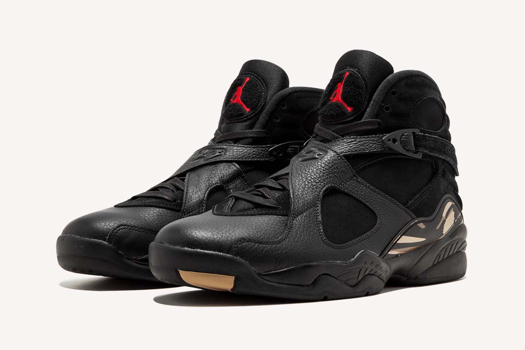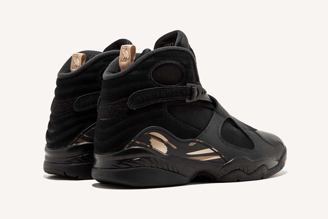 The OVO x Air Jordan 8 Retro ‘Black is a collaborative effort between Drakes OVO and Jordan Brand. Released in honor of the 2018 NBA All-Star Game, the sneaker features a white tumbled leather upper with red detailing on the Jumpman logo at the tongue, metallic gold accents on the toe box, heel pull tabs, and on the paint-stroke midfoot pattern. The sneaker also boasts a strap across the ankle and signature OVO branding and owl logos on the pull tabs.