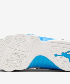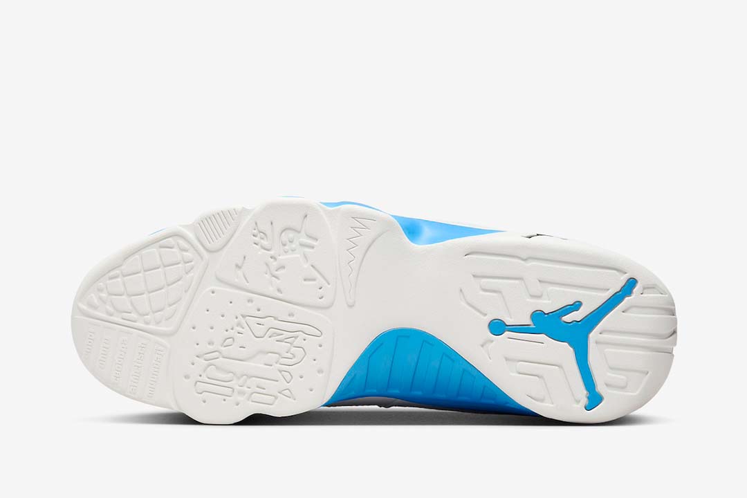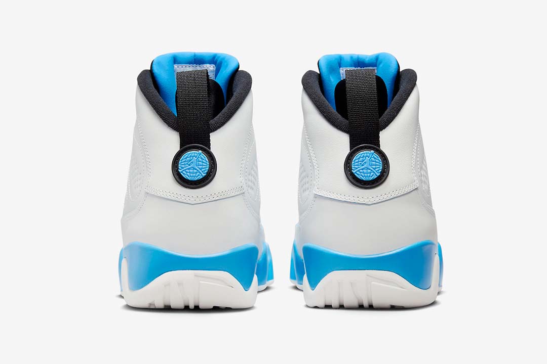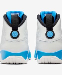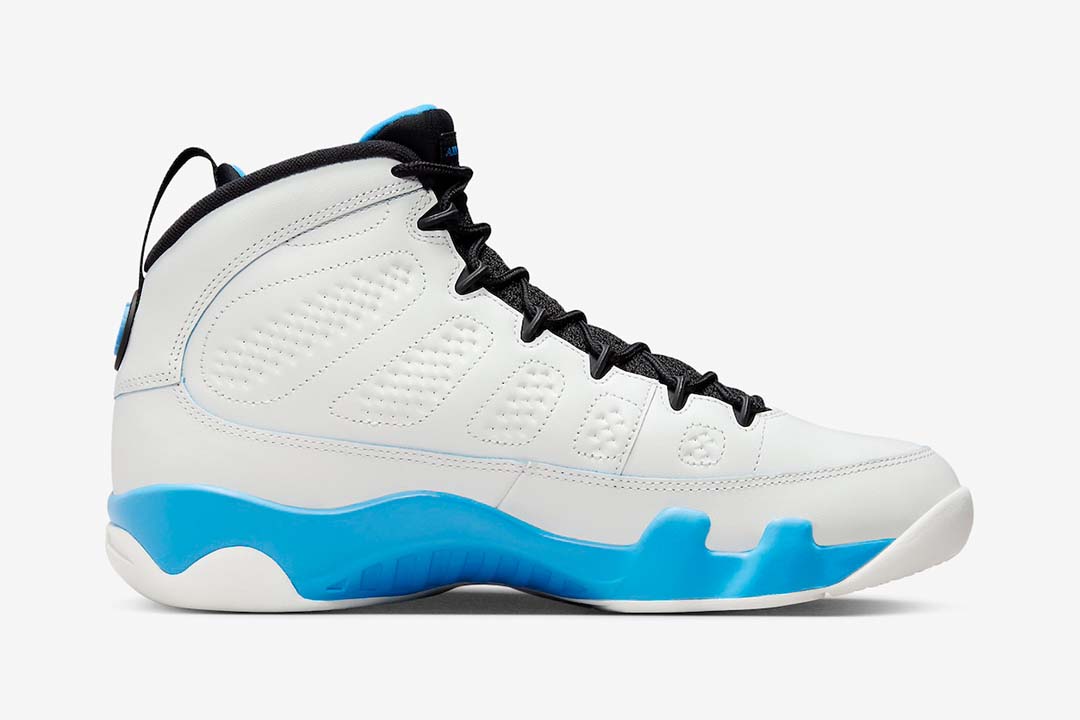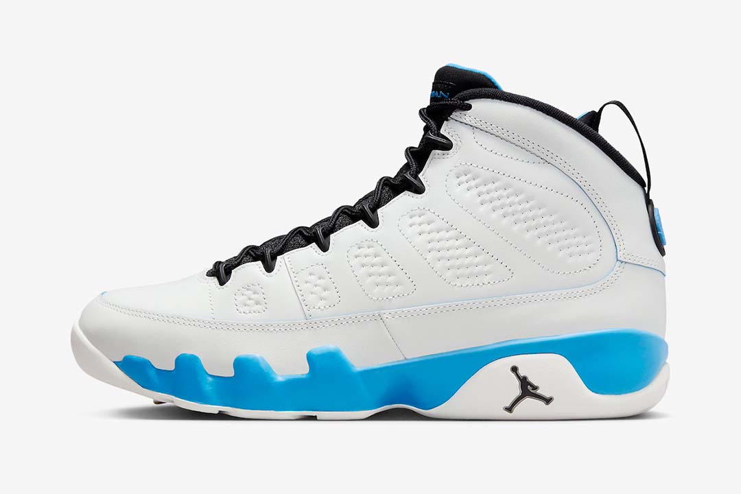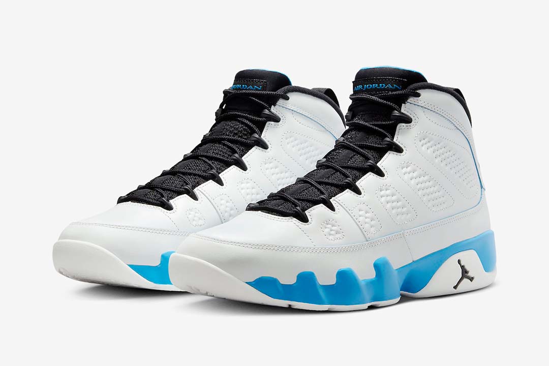 Dressed in a Summit White, Black, and Dark Powder Blue color scheme. This offering of the Air Jordan 9 will return in true OG form. It features a White leather upper with Black appearing on the tongue, eyelets, liner, Jumpman on the midsole, and heel pull tabs. Highlighting the shoe are Powder Blue contrasting accents along the midsole, tongue, branding, and heel. A solid White rubber sole completes the design. Unlike the 2010 pair, the 2024 will not include the #23 embroidered on the heels to match its OG 1994 release.
