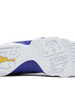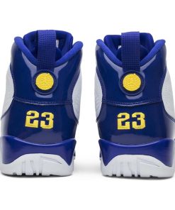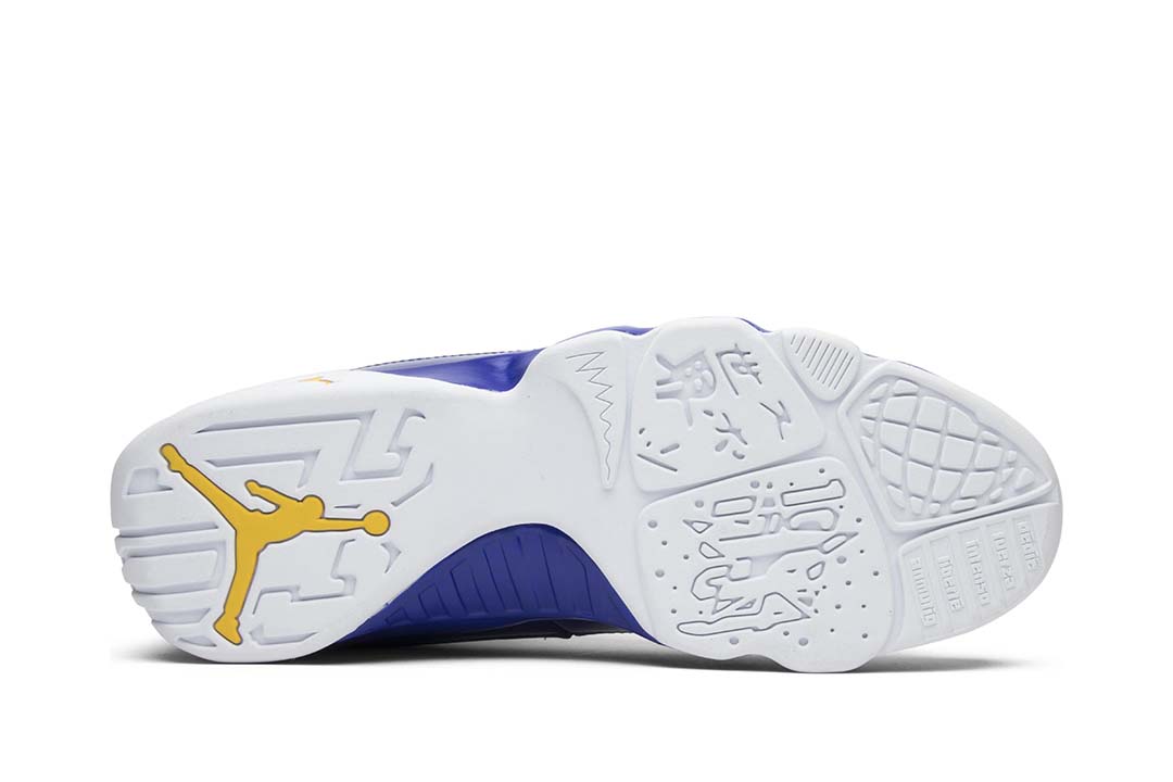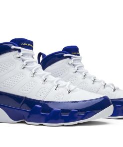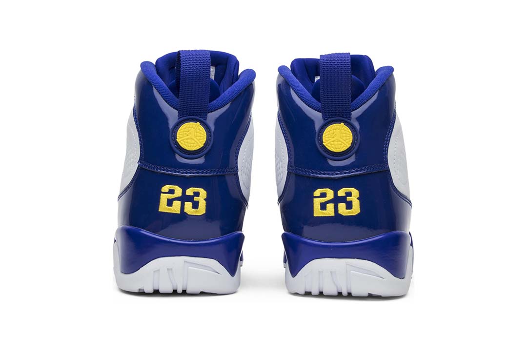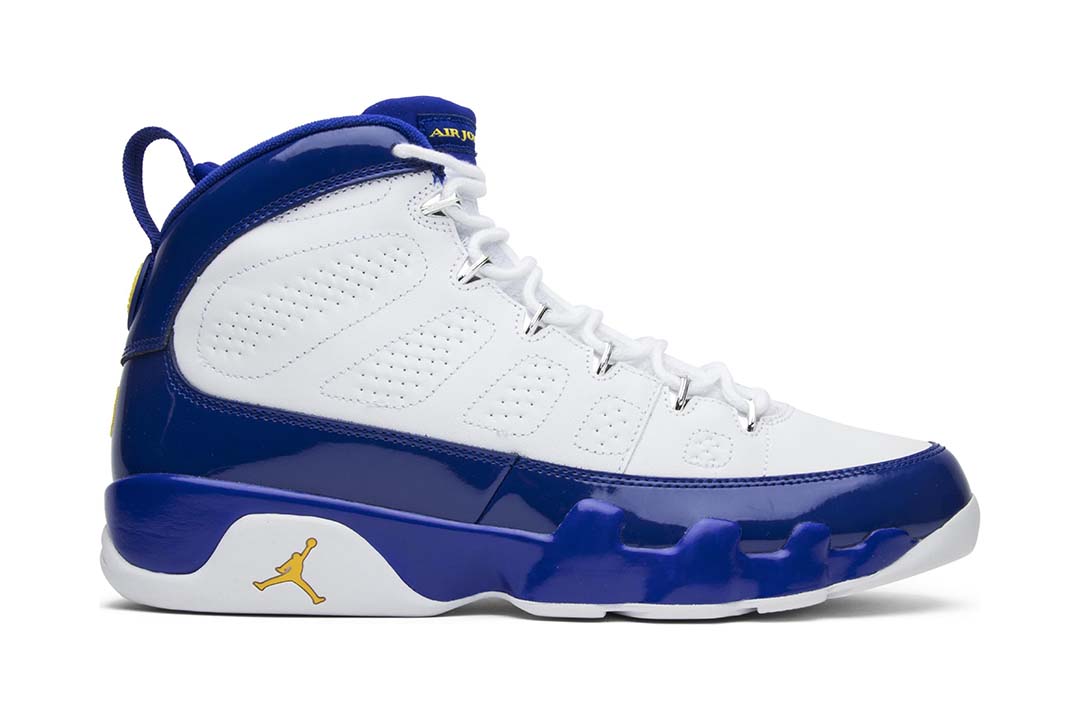 The Air Jordan 9 Retro BG ‘Kobe released in November 2016 alongside its adult-sized counterpart. The Lakers-inspired color scheme replicates the Jordan 9 PE that Kobe wore during a period of sneaker free agency throughout the 2002-03 NBA season. The mid-top features a white leather upper accented with patent leather overlays in Concord and pops of Tour Yellow on the shoes various branding elements.