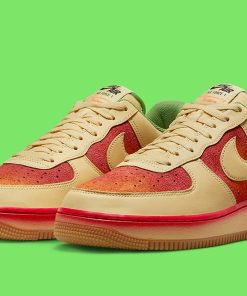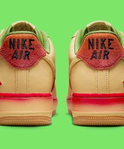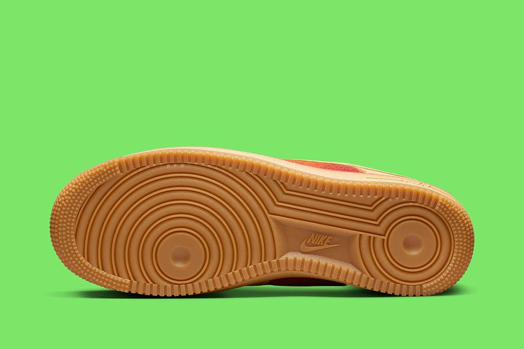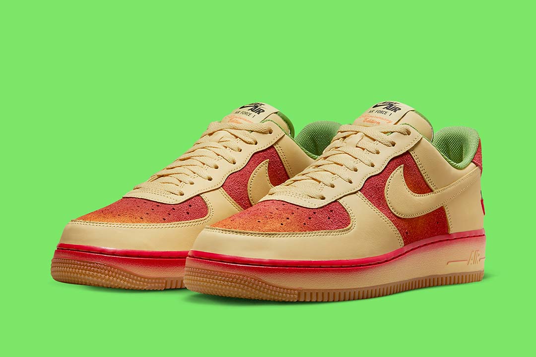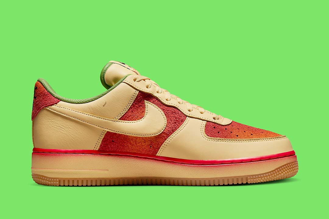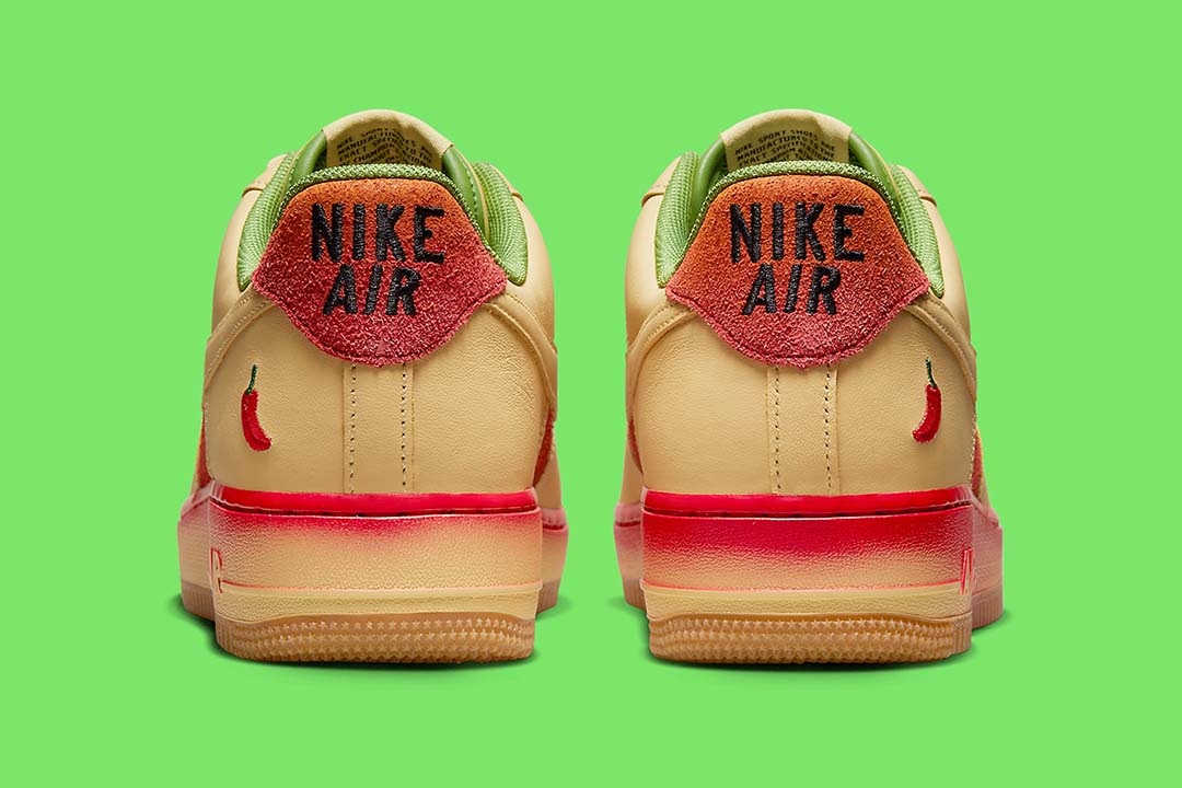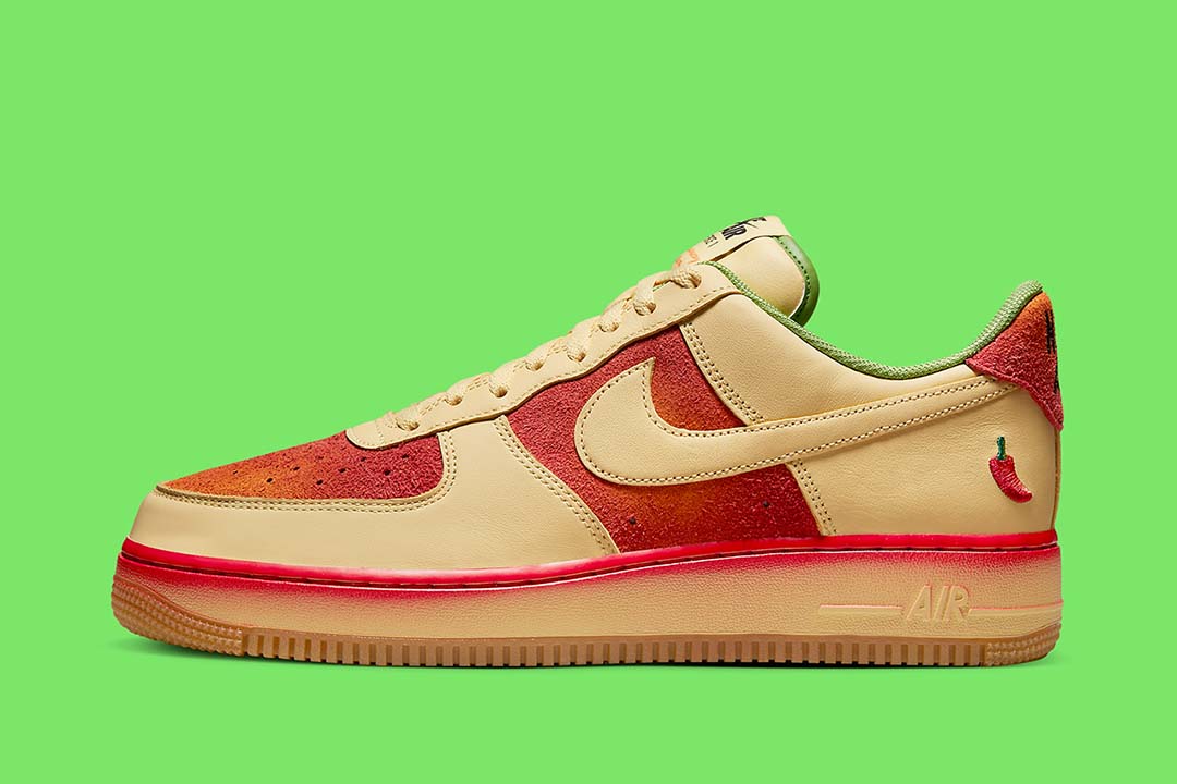 Officially included in the Anniversary Edition assortment of AF1s, this Air Force 1 Chili Pepper gets a slick design for lovers of capsaicin and all things hot. A yellowish tan leather overlay is joined by a weather suede in red, with the toe-box featuring a fade that denotes the gradual rise of spice level when consuming chili peppers. The same gradient appears at the uppermost rim of the midsole, fading into a less dangerous tan hue. A light green floods the interior to mark the most innocuous-looking color of the veggie, while the red hot chili pepper lands on the heel as well as the insoles via an embroidered logo.