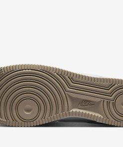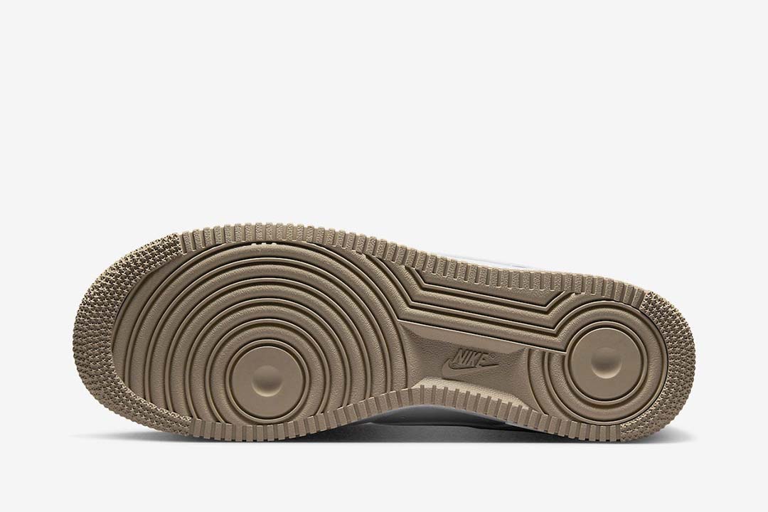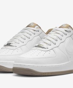This Nike Air Force 1 comes in a clean theme with White leather on the base. The same shade drapes the nylon tongues, laces, and midsole. Sticking out, a Taupe hue appears on the tongue labels, liner, heels, and the rubber outsole to finish the look.