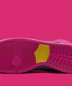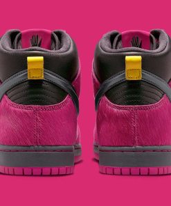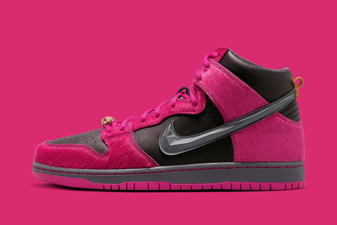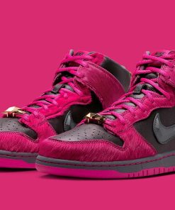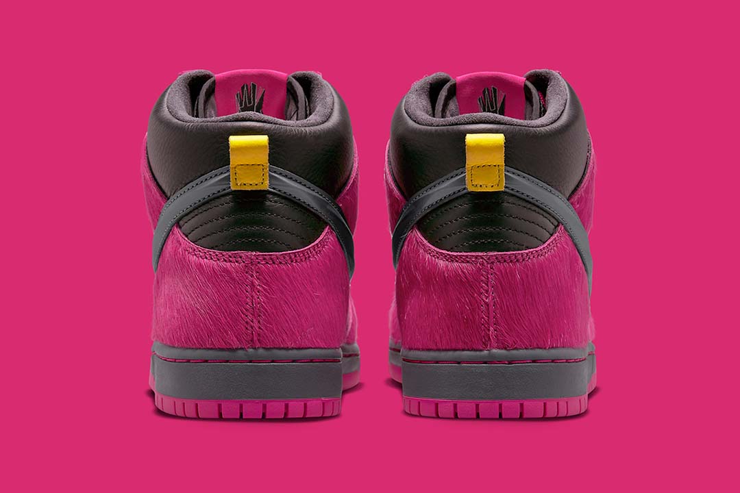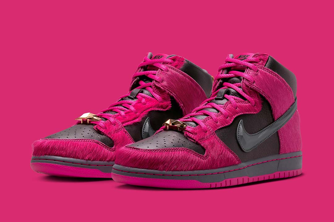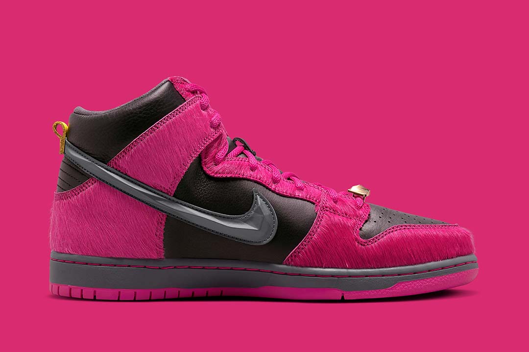 This, however, is not quite the case with the accompanying Dunk High. In addition to chiseling its Swoosh in the image of a jewel, the design turns Killer Mike and El-Ps signature insignia into crystallized dubraes, two variations of which ?? one gold, the other dark grey ?? come included with every pair. And besides executing its insole branding in a similar manner, these share little similarities with it above-mentioned counterpart, featuring faux fur overlays and a leather base clad in Active Pink and dark neutrals, respectively.