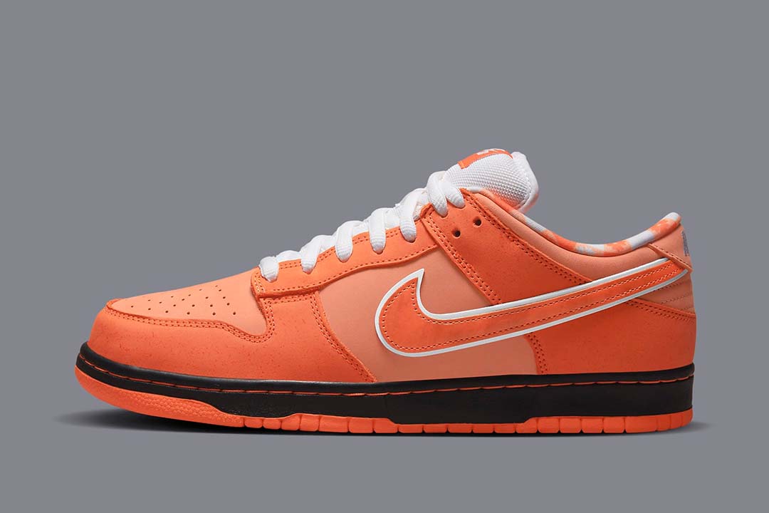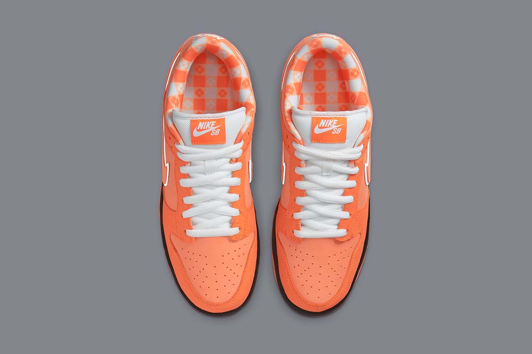 The Concepts x Nike Dunk Low SB ??Orange Lobster continues a collaborative series that originally kicked off in 2008. In crafting the shoes design, the Boston-based shop looks to the rare orange lobster for inspiration. Varying shades of orange are applied to the nubuck upper, featuring lightly speckled overlays and a tonal Swoosh outlined in white. A woven Nike SB tag embellishes the white mesh tongue, while a bib-themed pattern decorates the interior lining. The sneaker sits atop a traditional cupsole, featuring black sidewalls and a grippy orange rubber outsole.