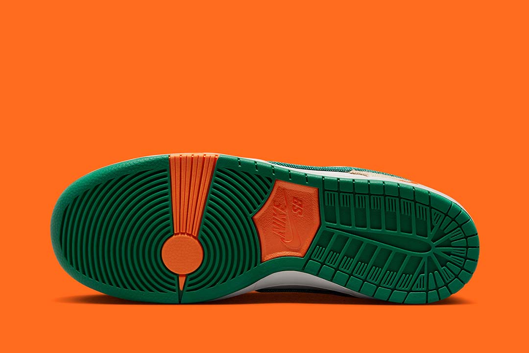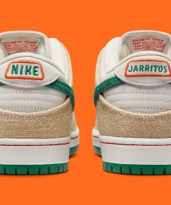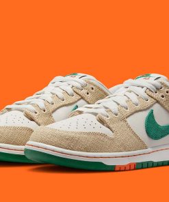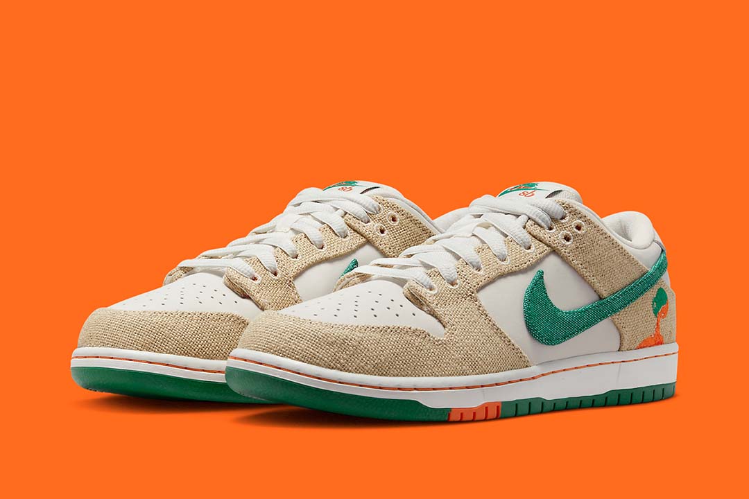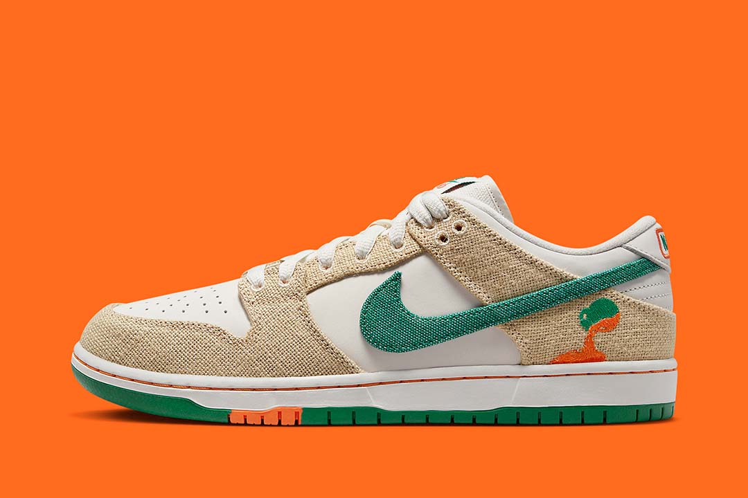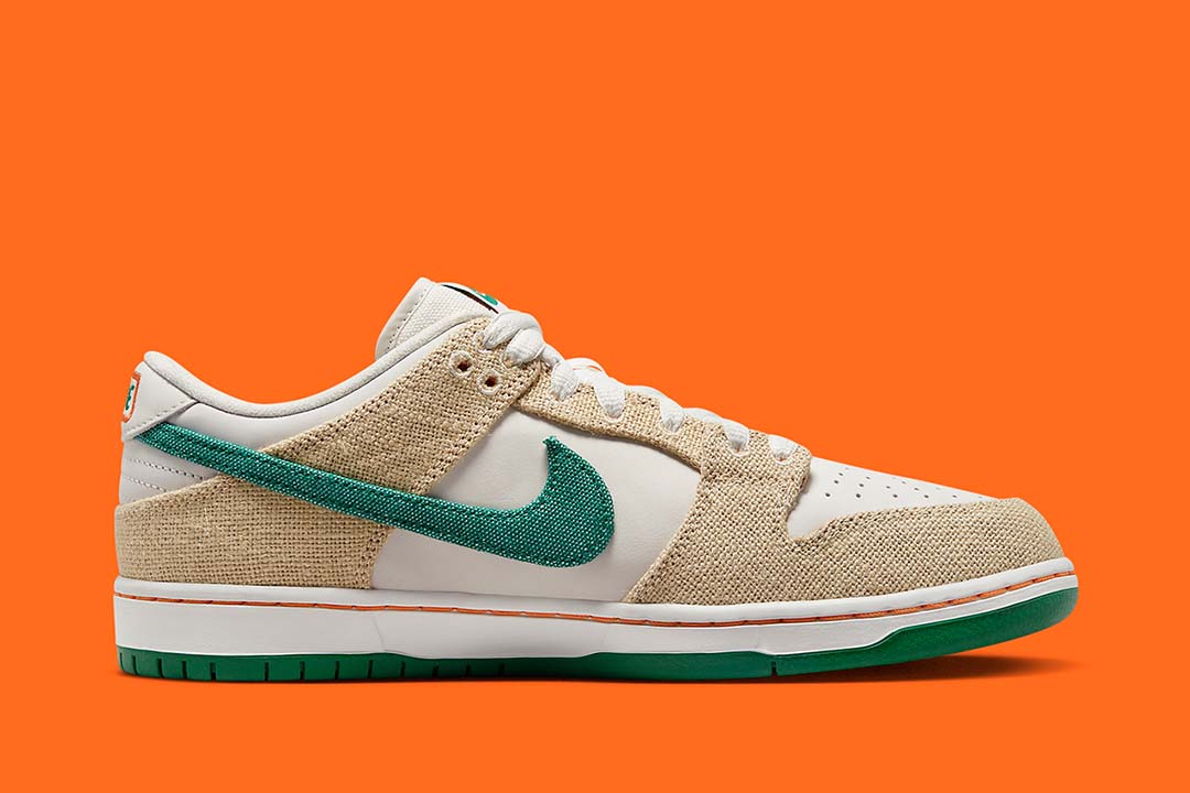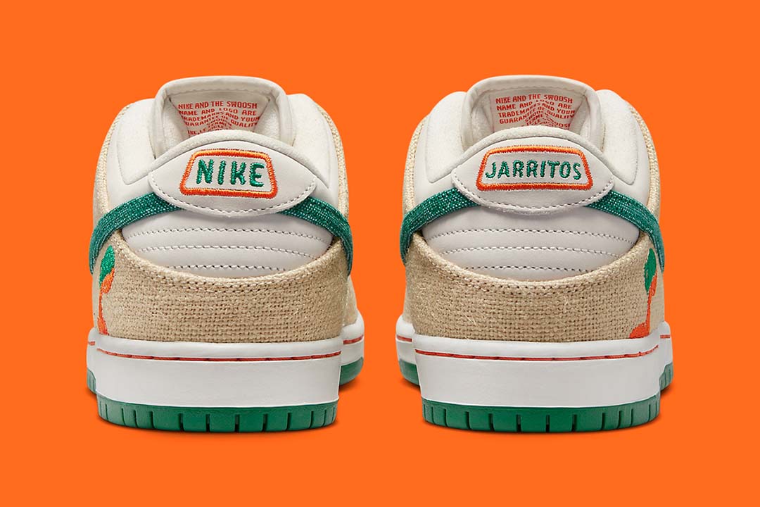 Jarritos, everyones favorite fruit-flavored Mexican soda brand, has officially collaborated with Nike SB for a thorough collection. The key drop of the capsule is, of course, the SB Dunk Low sneaker, revealed here via official brand images. Featuring a burlap/hemp overlay in tan, a green swoosh in twill, and a light grey leather base, this design reflects the Jarritos brand logo while possibly referencing the popular Mandarin flavor via the orange on the heel logo as well as the fore-foot of the outsole. A co-branded emblem appears on the insoles as well as the tongue logo, anchored by a trio of juice jugs. Finally, the heel tabs pay tribute to the two brands via customized logos in the Jarritos typeface.